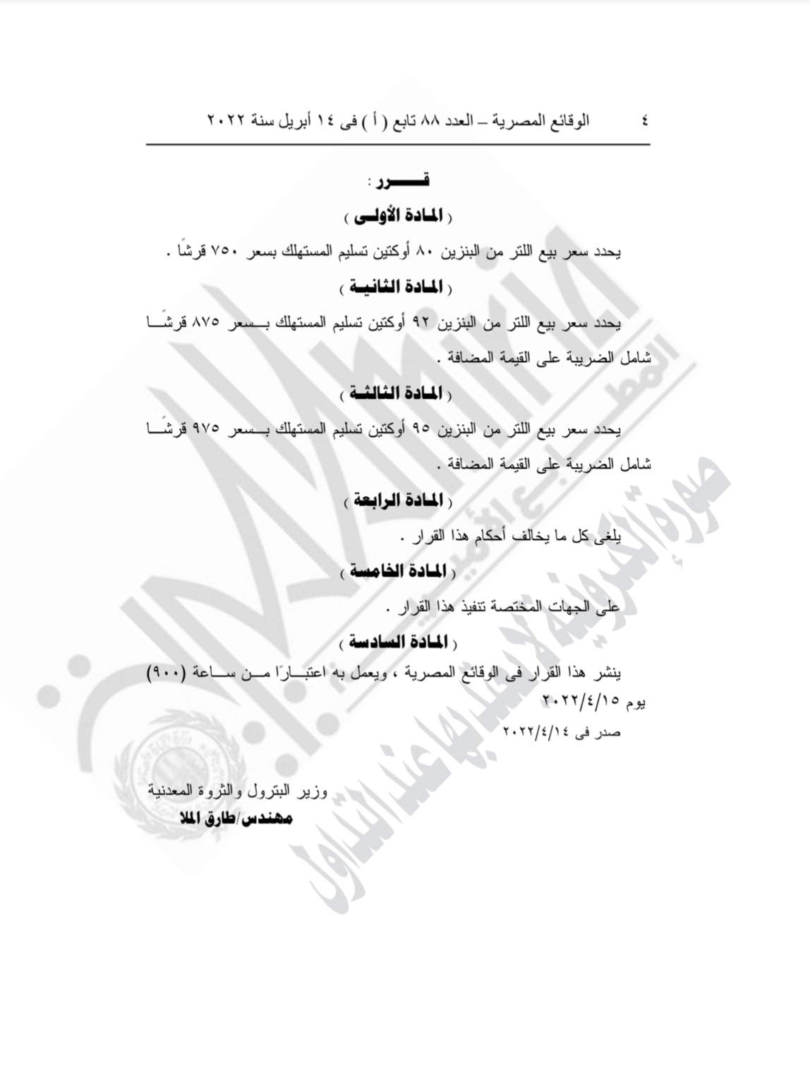 المادة الثانية " يحدد سعر بيع اللتر من البنزين 92 أوكتين تسليم المستهلك بسعر 875 قرشًا.
