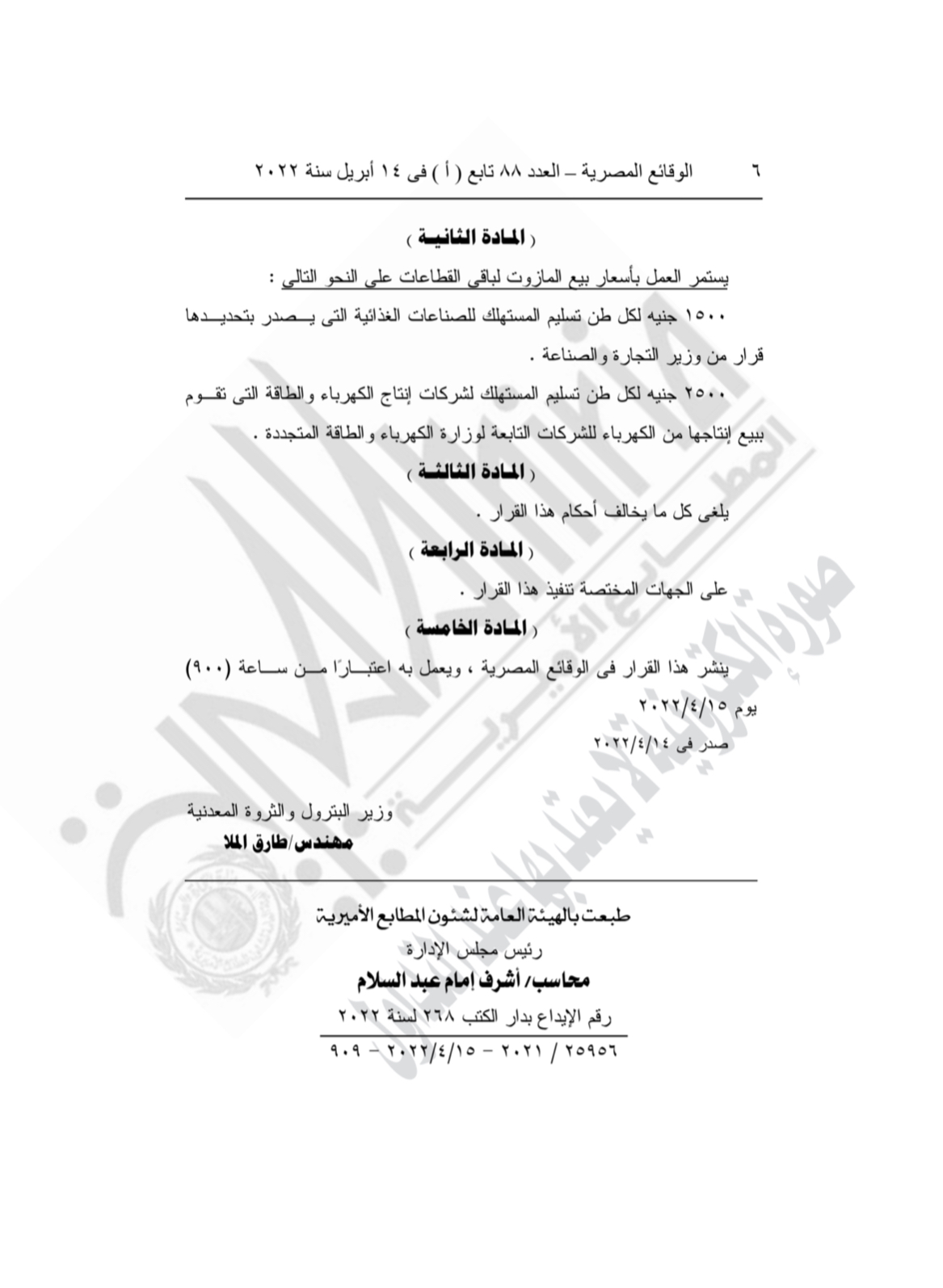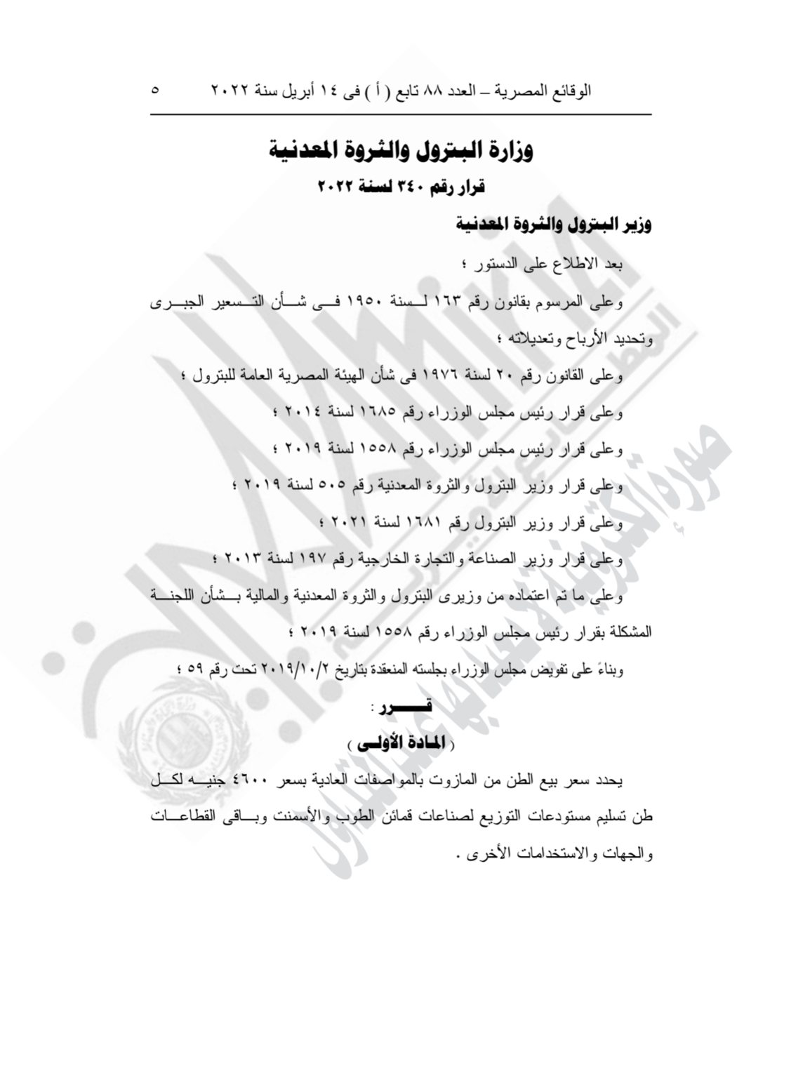 المادة الأولى: "يحدد سعر بيع الطن من المازوت بالمواصفات العادية بسعر 4600 جنيه لكل طن تسليم مستودعات التوزيع لصناعات قمائن الطوب والأسمنت وباقي القطاعات والجهات والاستخدامات الأخرى".