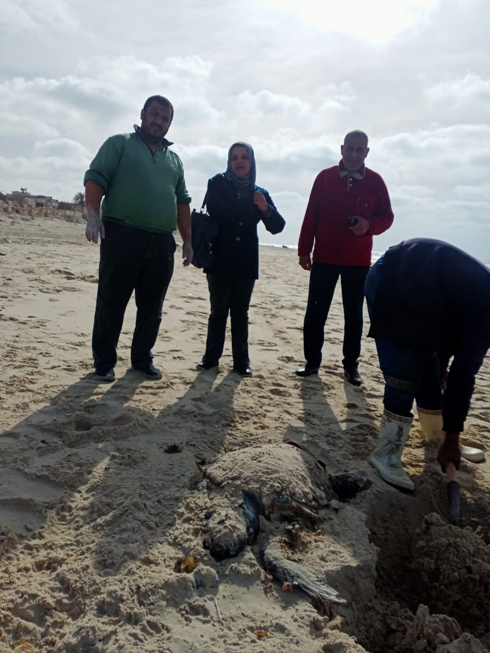 دفن 3 سلاحف بحرية نافقة على شاطئ مدينة العريش