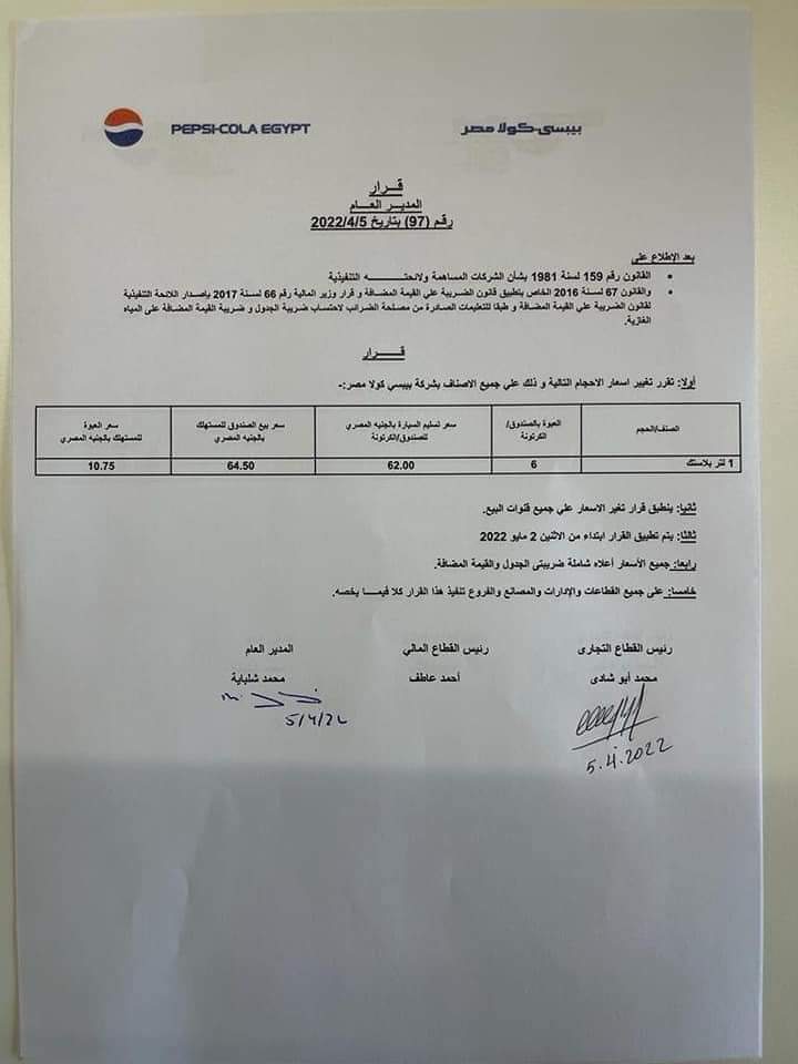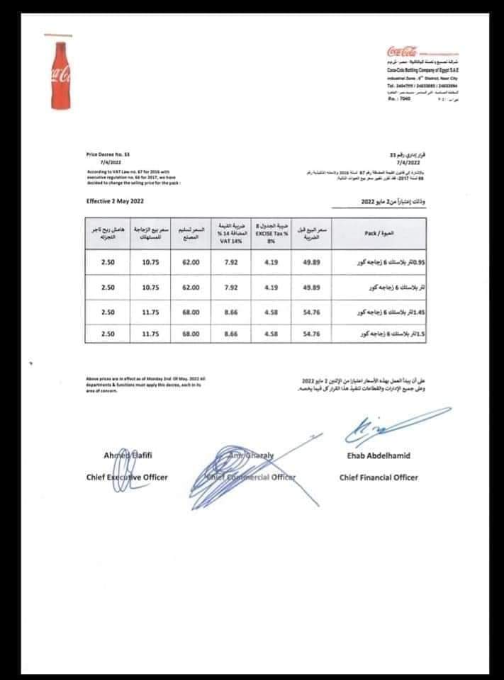 ولفت النظر إلى أن شركات المياه الغازية قررت رفع أسعار المنتجات بداية من مايو المقبل؛ حيث قررت شركة بيبسي وكوكاكولا مصر زيادة أسعار منتجاتهما بمبلغ 75 قرشًا للعبوة، وذلك بداية من 2 مايو القادم، وقامت الشركة بإبلاغ الموزعين بذلك.