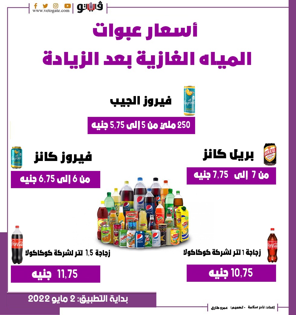 أسعار عبوات المياه الغازية بعد الزيادة | إنفوجراف السبت 16/أبريل/2022 - 05:00 ص 4/16/2022 5:00:14 AM اسعار المياه الغازية نادر سلامة شارك طباعة 18 حجم الخط شارك طباعة اسعار المياه شركات المياه كوكاكولا الأسواق شهر مايو المياه الغازية