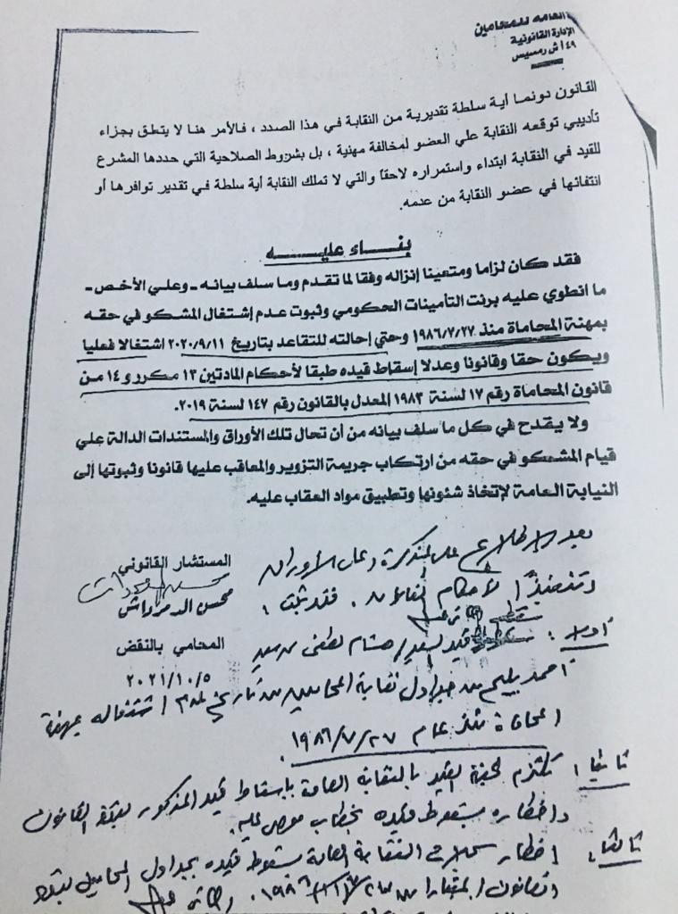 واستجابت المحكمة لطلب نقيب المحامين الراحل رجائي عطية في ضوء تأكدها من جدية الدفع بعد مطالعة المستندات المطعون بتزويرها على النجو الوارد بقرار المحكمه بتأجيل نظر الدعوى لاتخاذ إجراءات الطعن بالتزوير على المستندات المقدمة من العضو المذكور، وهو ما انتفض معه بعض المحامين الشرفاء نصرة لنقيب المحامين فقاموا بتقديم بلاغ مؤيد بالمستندات ضد هذا العضو أمام النيابة العامة والنيابة الإدارية، تثبت قيام المشكو فى حقه بارتكاب العديد من المخالفات إبان فتره عمله بقطاع البترول منها على سبيل المثال ما يلي: