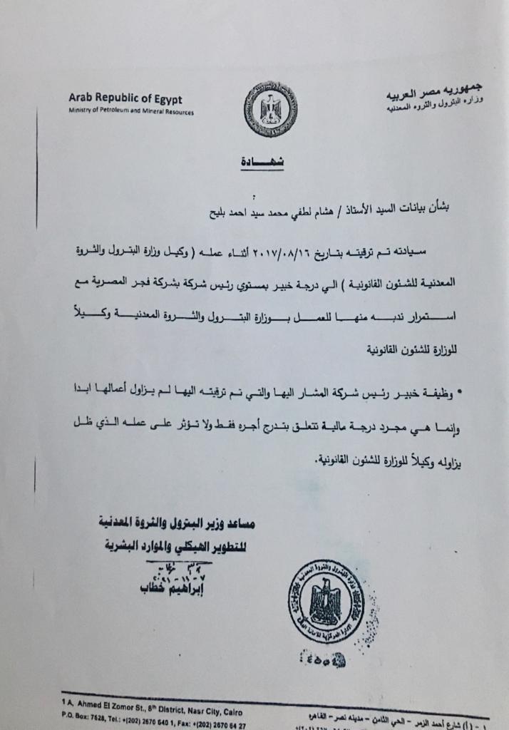 كما تم النص بالقرارات على ندب مساعدي وزير البترول من جهة عملهما الأصلية رغم كونهما بالمعاش، ولا تربطهما بالوزارة أي علاقة وظيفية، وجهة العمل الذين يزعمون ندبهما منها، لا تعدو سوى عقود استشارات بشركات استثمارية بالمخالفة لأحكام قانون تنظيم التعاقدات الحكومية، والذي حدد الوحدات التي يجوز الندب منها، وذلك بقصد التحايل على الحد الأقصى المحدد لمكافأة مساعد الوزير المحددة بقرار رئيس الوزراء بخمسة وعشرين ألف جنيه شهريًا