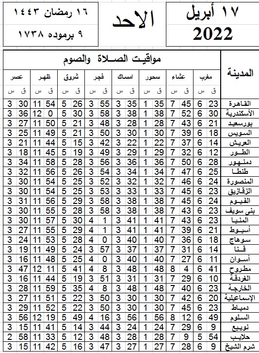 وجاءت مواقيت الصلاة اليوم وفقًا للتوقيت المحلي لمدينتي القاهرة والإسكندرية وعدد من مدن ومحافظات الجمهورية كالتالي: