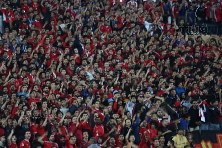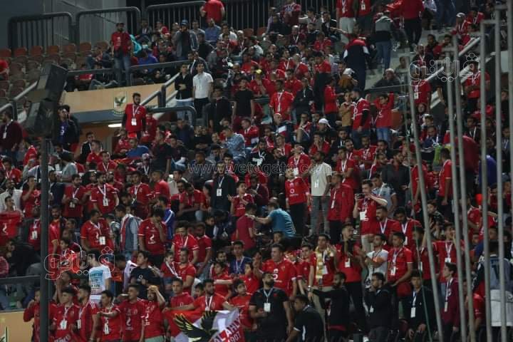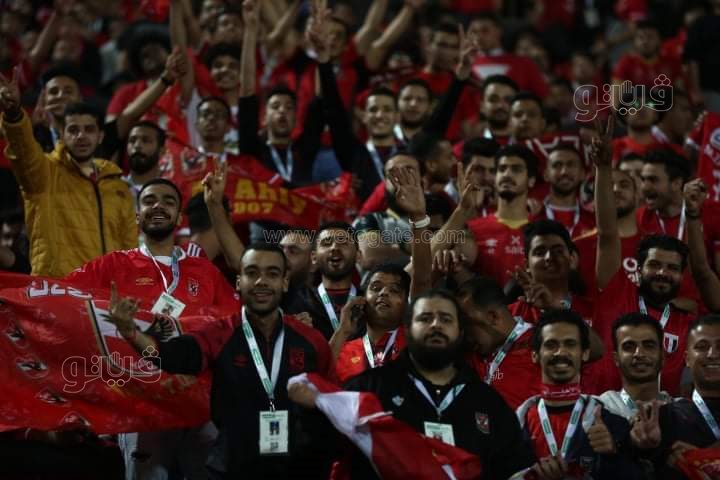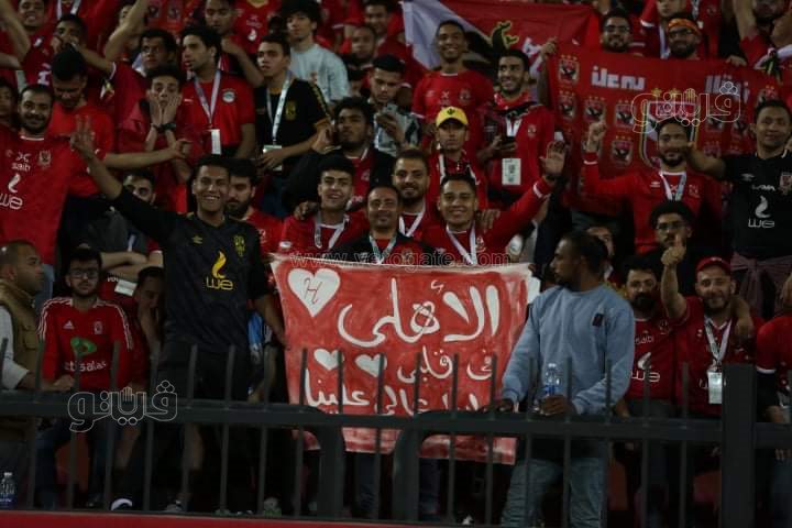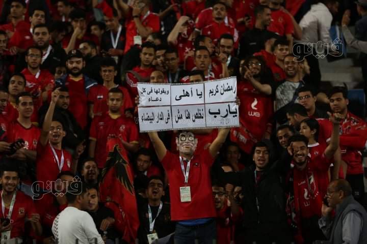 ورفعت جماهير الاهلي أعلام الفريق مع لافتات مدون عليها: "التيشرت يا شناوي.. رمضان كريم يا أهلي وبقولها في كل دعاء يارب نخلص هنا مش في الدار البيضاء".