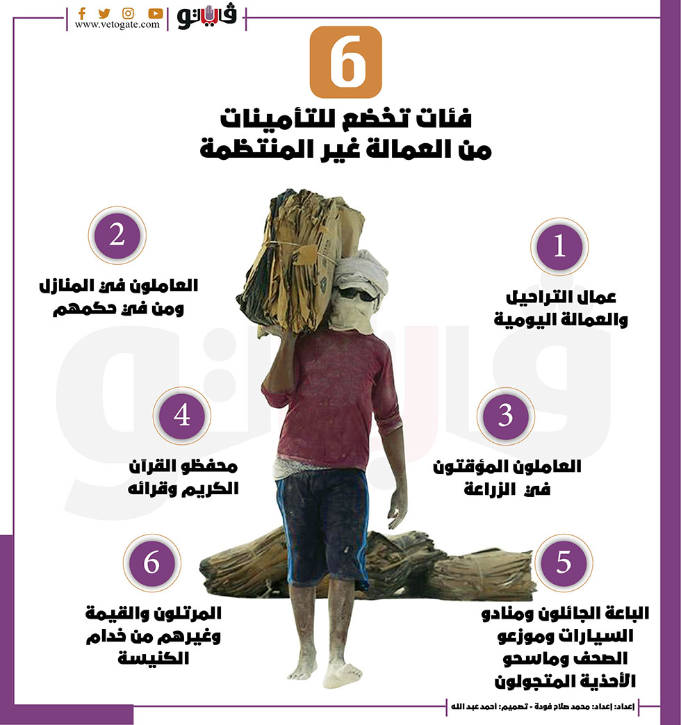 6 فئات تخضع للتأمينات من العمالة غير المنتظمة|أنفوجراف الأحد 17/أبريل/2022 - 01:26 م 4/17/2022 1:26:52 PM العمالة غير المنتظمة محمد صلاح فودة شارك طباعة 18 حجم الخط شارك طباعة العمالة غير المنتظمة الباعه الجائلين العمالة اليومية التأمنيات على العمالة غير المنتظمة