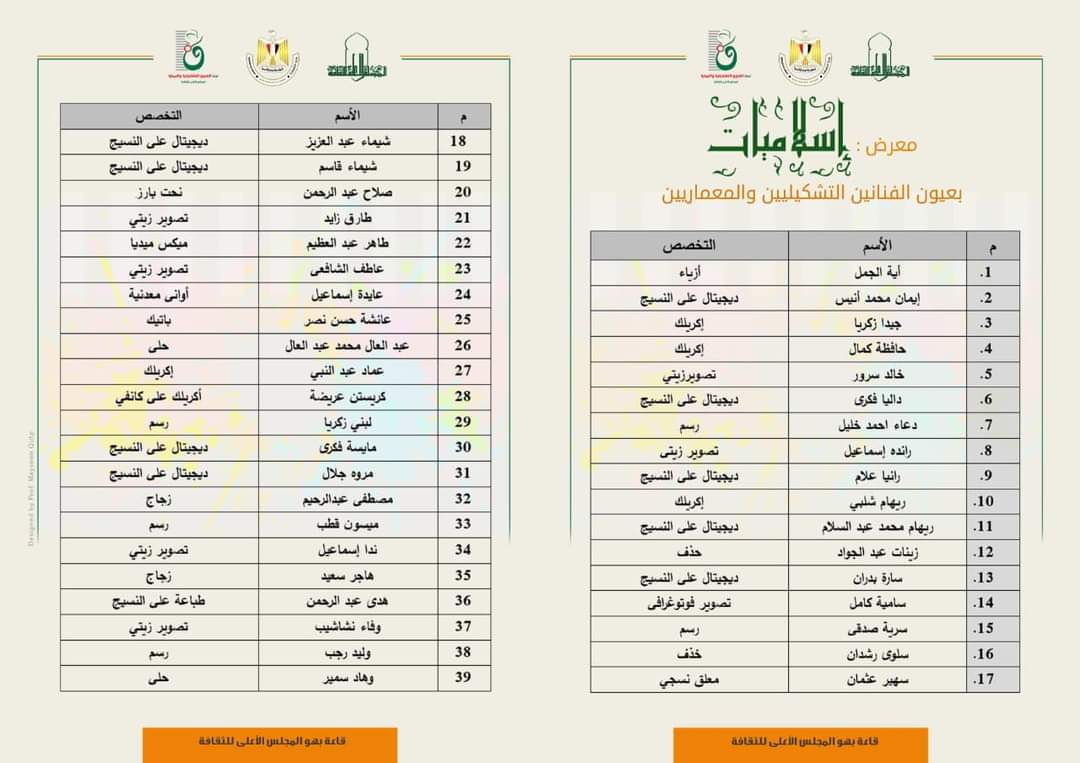 ومعرضًا للفن النفعى/ الوظيفى نماذج من الفن الوظيفى "ذات الهوية المصرية بصبغة إسلامية" ( إكسسوارات الحلى / أزياء معاصرة / معلقات / أوانى استعمالية خزفية / أوانى زجاجية).
