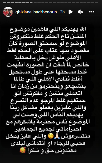 ونشرت غزلان عبر حسابها الخاص على "إنستجرام": توضيحًا تؤكد فيه: "الله يهديكم اللي فاهمين موضوع المنشن بتاع الحكم غلط ماتكبروش الموضوع لو سمحتم.. كان المقصود بيها عتاب على الحكم فقط والأهلي مالوش دخل في الحكاية".