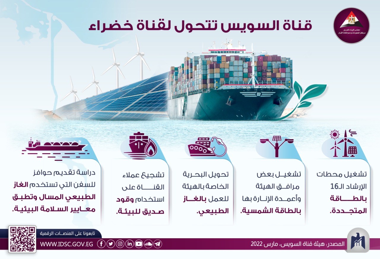 نشر مركز المعلومات ودعم اتخاذ القرار بمجلس الوزراء المصري إنفوجراف يرصد خلاله الجهود الأخيرة لهيئة قناة السويس نحو التحول لقناة خضراء تطبق معايير الاستدامة البيئية ومكافحة تلوث المناخ.