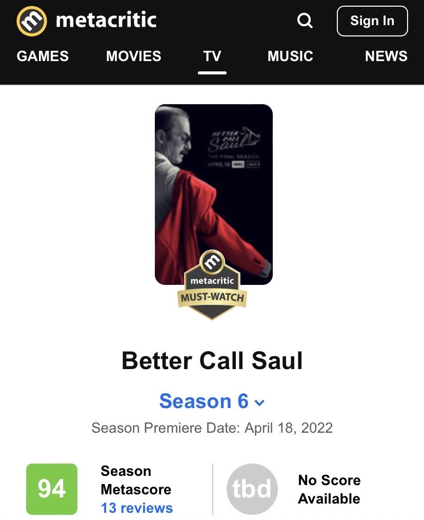 حصل الموسم السادس والأخير من مسلسل Better Call Saul على تقييم بنسبة 94% من موقع "Metacritic"، ومن المقرر عرض أول حلقتين من المسلسل بتاريخ 18 أبريل الجاري.