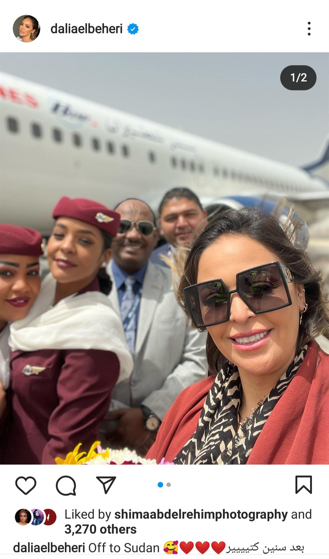 وعلقت الفنانة داليا البحيري قائلة :" بعد سنين كتير قوى رايحة البلد اللى قضيت فيها جزء مهم من ذكريات طفولتى.. بلد الطيبة والخير والمحبة بلدى الثانى السودان الحبيب " .