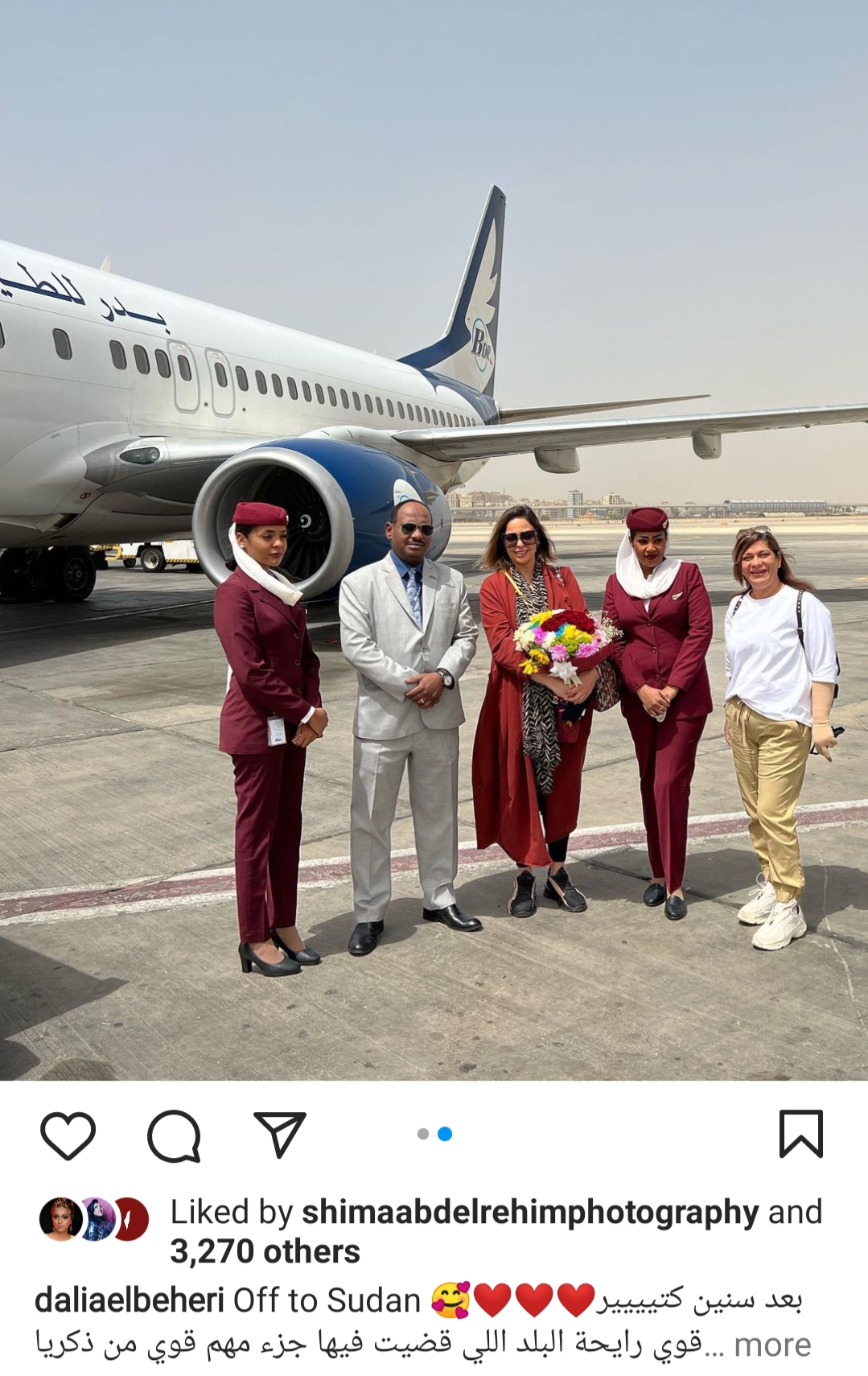 شاركت الفنانة داليا البحيري جمهورها بصورة جديدة لها، بصحبة طاقم ضيافة طيران بدر بأحد مطارات السودان، على حسابها الرسمى بموقع الصور الشهير انستجرام.