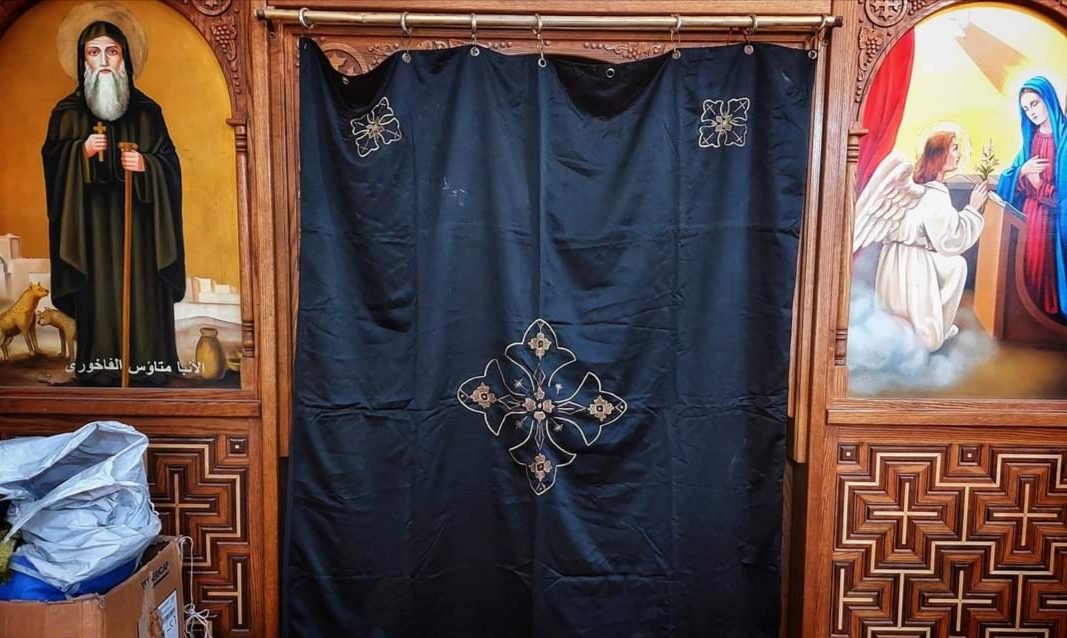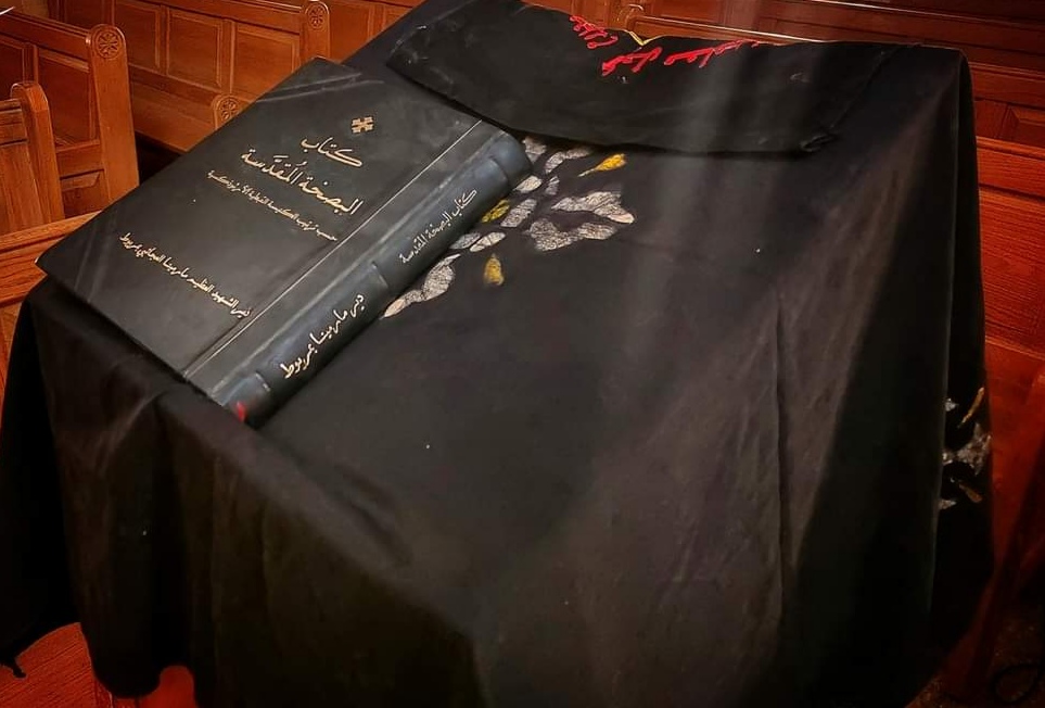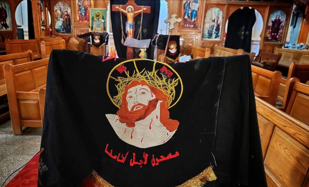 حيث قام خدام الكنائس والشمامسة، بتعليق الرايات السوداء وتكسية أعمدة الكنيسة بالشارات بالسواد، وتعلق الستائر السوداء على بعض جدران الكنيسة.