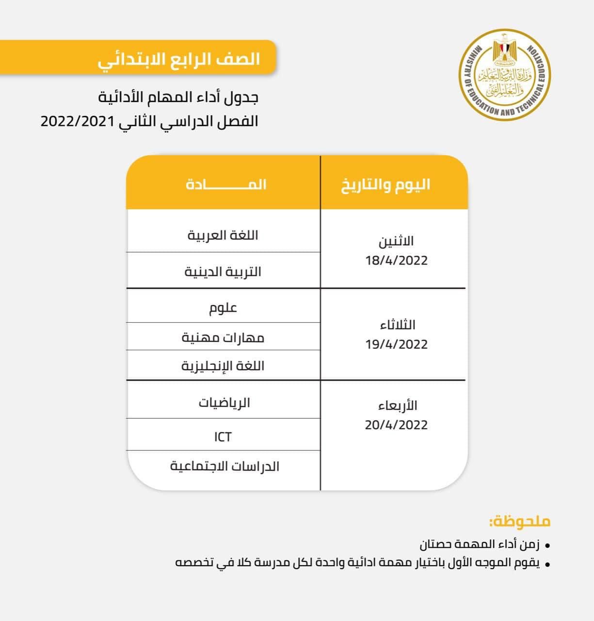 وكانت وزارة التربية والتعليم والتعليم الفني قد أعلنت عن جدول المهام الأدائية لطلاب الصف الرابع الابتدائي للفصل الدراسي الثاني للعام الدراسي ٢٠٢٢/٢٠٢١.