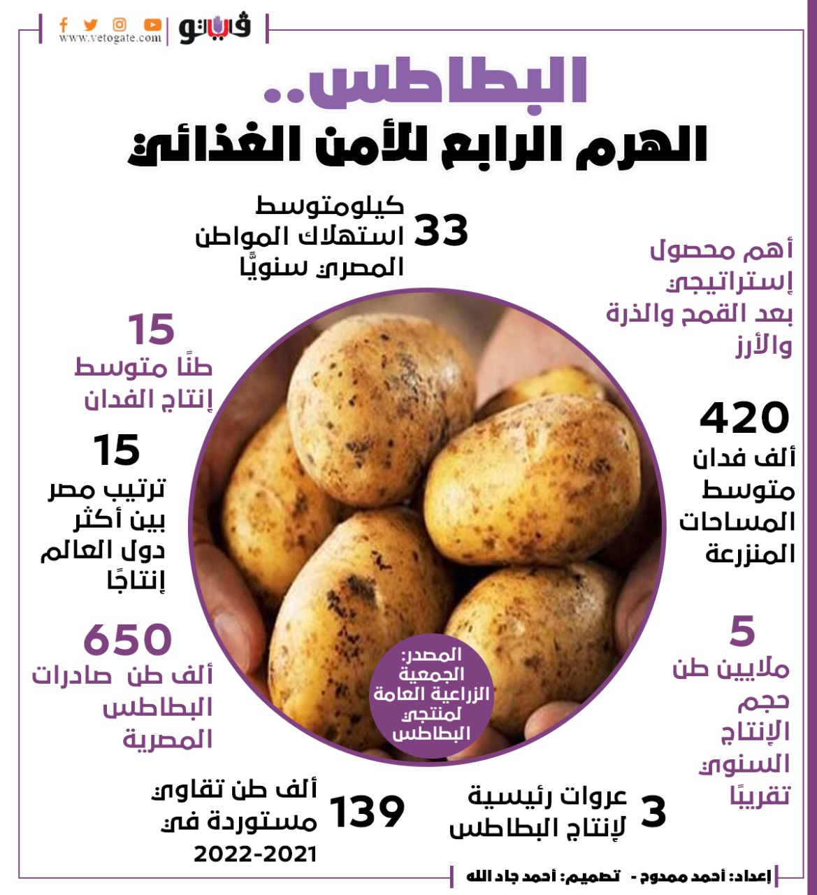 البطاطس.. الهرم الرابع للأمن الغذائي | إنفوجراف الثلاثاء 19/أبريل/2022 - 02:02 م 4/19/2022 2:02:27 PM أحمد ممدوح شارك طباعة 18 حجم الخط شارك طباعة