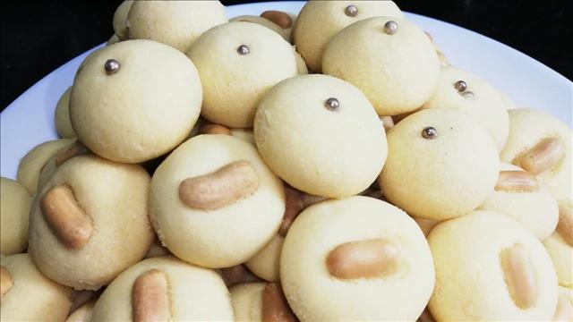 نبدأ بعد ذلك في تشكيل الغريبة بالطريقة المعتادة، وبشكلها المميز الصغير المستدير، ونرصها في صواني الفرن.