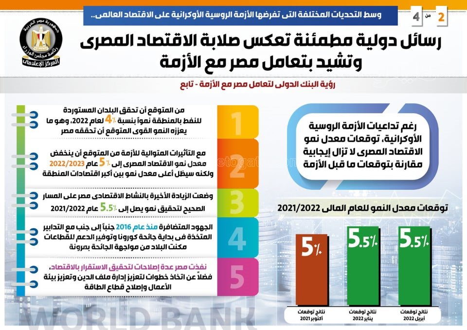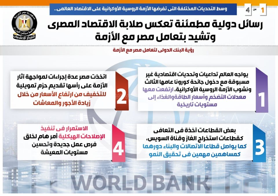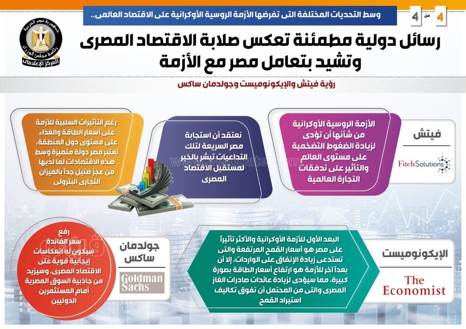 وفي هذا الصدد نشر المركز الإعلامي لمجلس الوزراء تقريرًا تضمن إنفوجرافات تسلط الضوء على الرسائل الدولية المطمئنة التي تعكس صلابة الاقتصاد المصري وتشيد بتعامل مصر مع التحديات المختلفة التى تفرضها الأزمة الروسية الأوكرانية على الاقتصاد العالمي.
