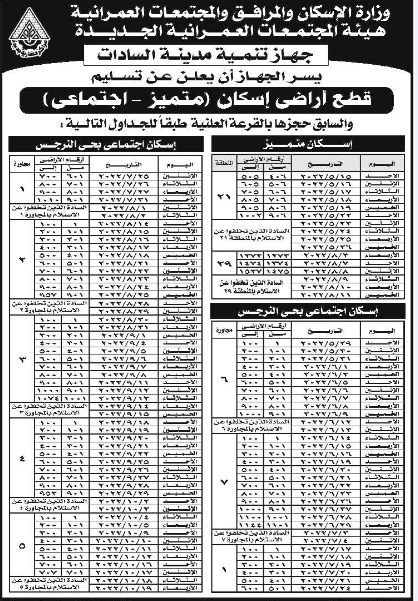 مواعيد تسليم أراضي الإسكان الاجتماعي والمتميز لحاجزيها بمدينة السادات