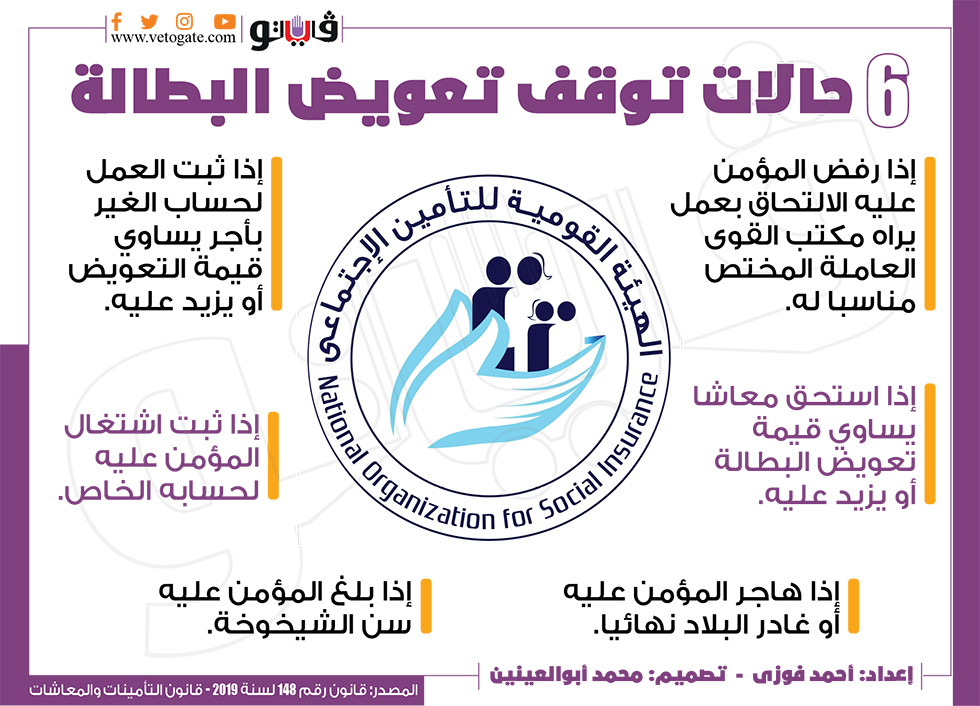 6 حالات توقف تعويض البطالة| إنفوجراف الجمعة 22/أبريل/2022 - 04:54 م 4/22/2022 4:54:41 PM نيفين القباج احمد فوزي شارك طباعة 18 حجم الخط شارك طباعة قانون التأمينات الاجتماعية الشيخوخة التأمينات القوى العاملة المعاشات البطالة