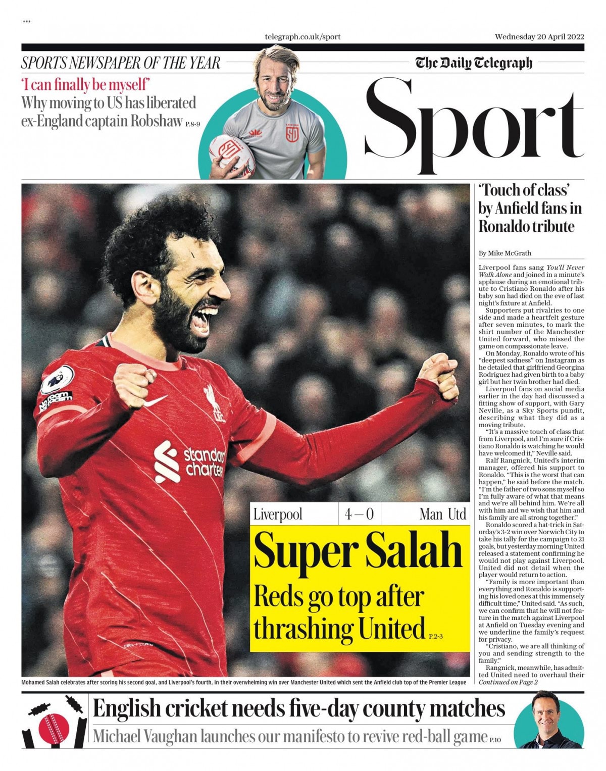 وتطرقت صحيفة تليجراف للحديث عن فوز ليفربول على مانشستر يونايتد 4-0 في الدوري الإنجليزي الممتاز، وعنونت غلافها: ”سوبر صلاح“، الريدز يتصدر بعد سحق اليونايتد.