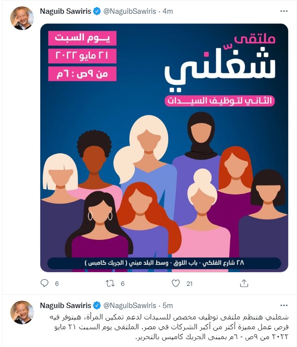 وكتب نجيب ساويرس تغريدة على تويتر قال فيها: "شغلني هتنظم ملتقى توظيف مخصص للسيدات لدعم تمكين المرأة، هيتوفر فيه فرص عمل مميزة أكتر من أكبر الشركات في مصر. الملتقى يوم السبت ٢١ مايو ٢٠٢٢ من ٩صباحا - ٦مساء بمبنى الجريك كامپس بالتحرير."