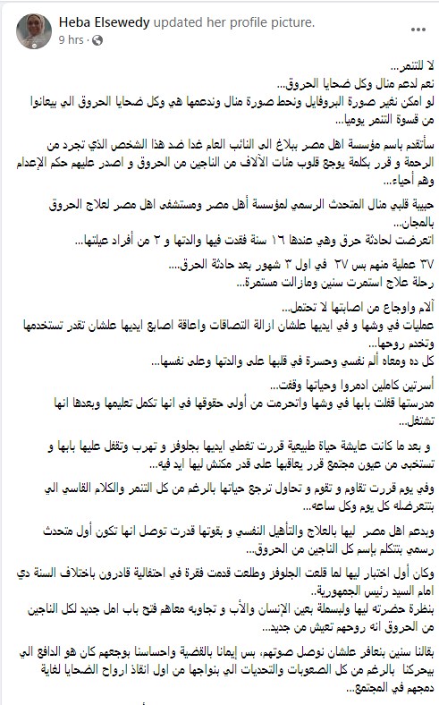 وتابعت "حبيبة قلبي منال المتحدث الرسمي لمؤسسة أهل مصر ومستشفى أهل مصر لعلاج الحروق بالمجان... اتعرضت لحادثة حرق وهي عندها ١٦ سنة فقدت فيها والدتها و٢ من أفراد عيلتها... ٣٧ عملية منهم بس ٢٧ في أول ٣ شهور بعد حادثة الحرق.... رحلة علاج استمرت سنين ومازالت مستمرة... آلام واوجاع من إاصابتها لا تحتمل... عمليات في وشها وفي ايديها علشان إزالة التصاقات وإعاقة اصابع ايديها علشان تقدر تستخدمها وتخدم روحها..."