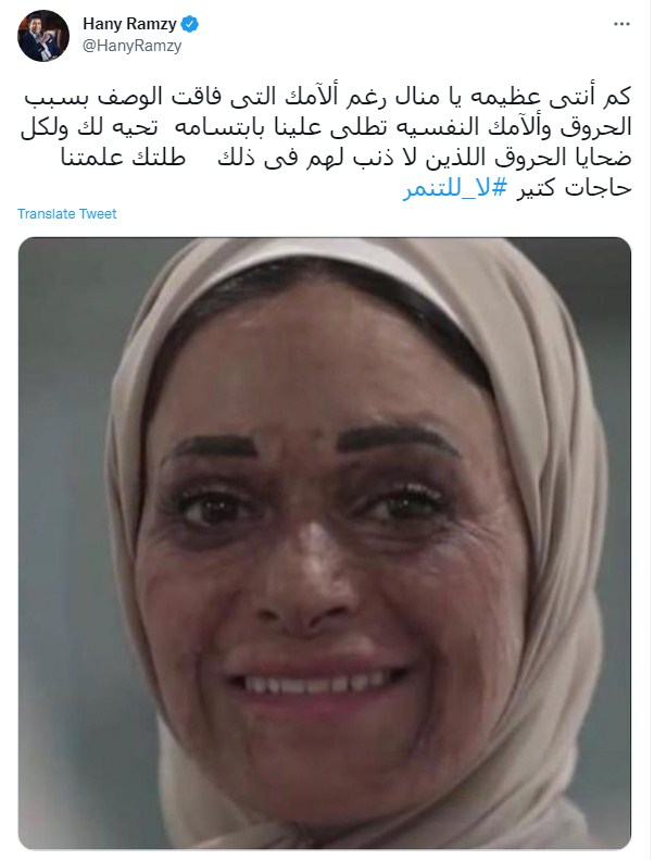 وكتب هاني رمزي تغريدة على تويتر "كم أنتي عظيمة يا منال رغم ألامك التي فاقت الوصف بسبب الحروق وألامك النفسية تطلى علينا بابتسامة تحية لك ولكل ضحايا الحروق الذين لا ذنب لهم في ذلك طلتك علمتنا حاجات كتير #لا_للتنمر"