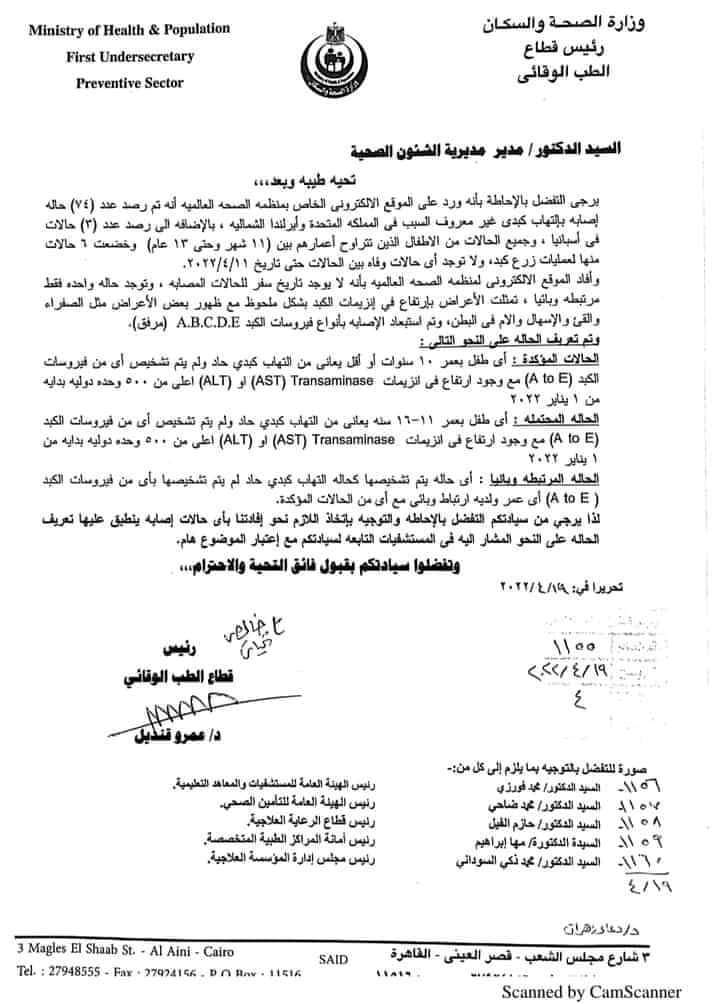 أصدر الدكتور عمرو قنديل رئيس قطاع الطب الوقائي بـ وزارة الصحة منشور لكل قطاعات وزارة الصحة بشأن رصد حالات الإصابة بالالتهاب الكبدى عند الأطفال في عدد من دول العالم منها أيرلندا والمملكة المتحدة غير معروفة السبب.