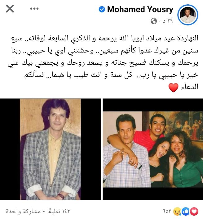 وكتب محمد يسري منشورًا عبر حسابه الشخصي بموقع التواصل الاجتماعي فيس بوك، قال فيه: النهاردة عيد ميلاد أبويا الله يرحمه والذكرى السابعة لوفاته.. 7 سنين من غيرك عدوا كأنهم سبعين.