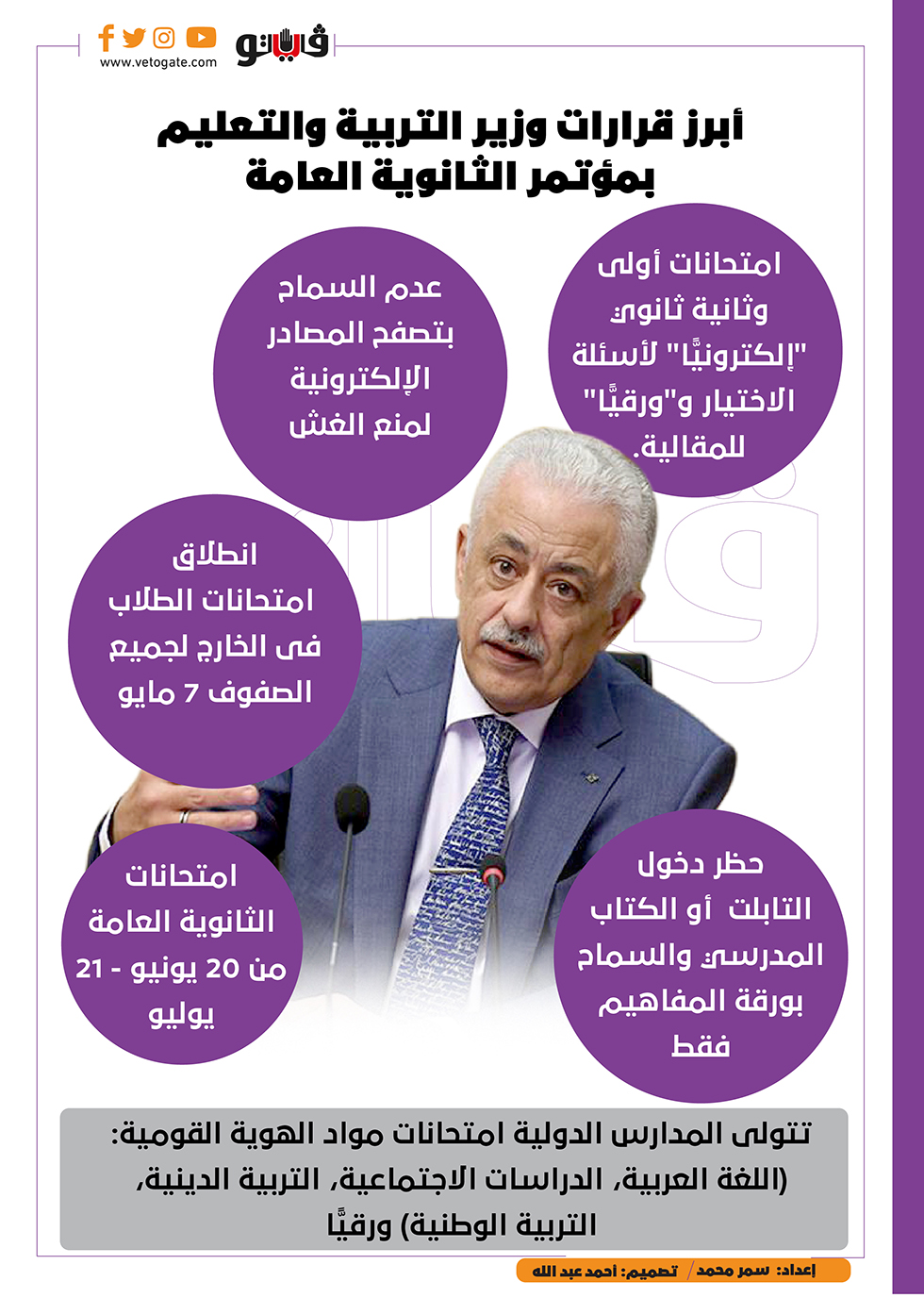 أبرز قرارات وزير التربية والتعليم بمؤتمر الثانوية العامة | إنفوجراف الأربعاء 20/أبريل/2022 - 08:40 م 4/20/2022 8:40:37 PM قرارات وزير التربية والتعليم بمؤتمر الثانوية العامة سمر محمد شارك طباعة 18 حجم الخط شارك طباعة امتحانات أولى وثانية ثانوي وزير التربية والتعليم امتحانات الثانوية العامة امتحانات الثانوية قرارات وزير التربية والتعليم امتحانات أبناؤنا في الخارج امتحانات مواد الهوية