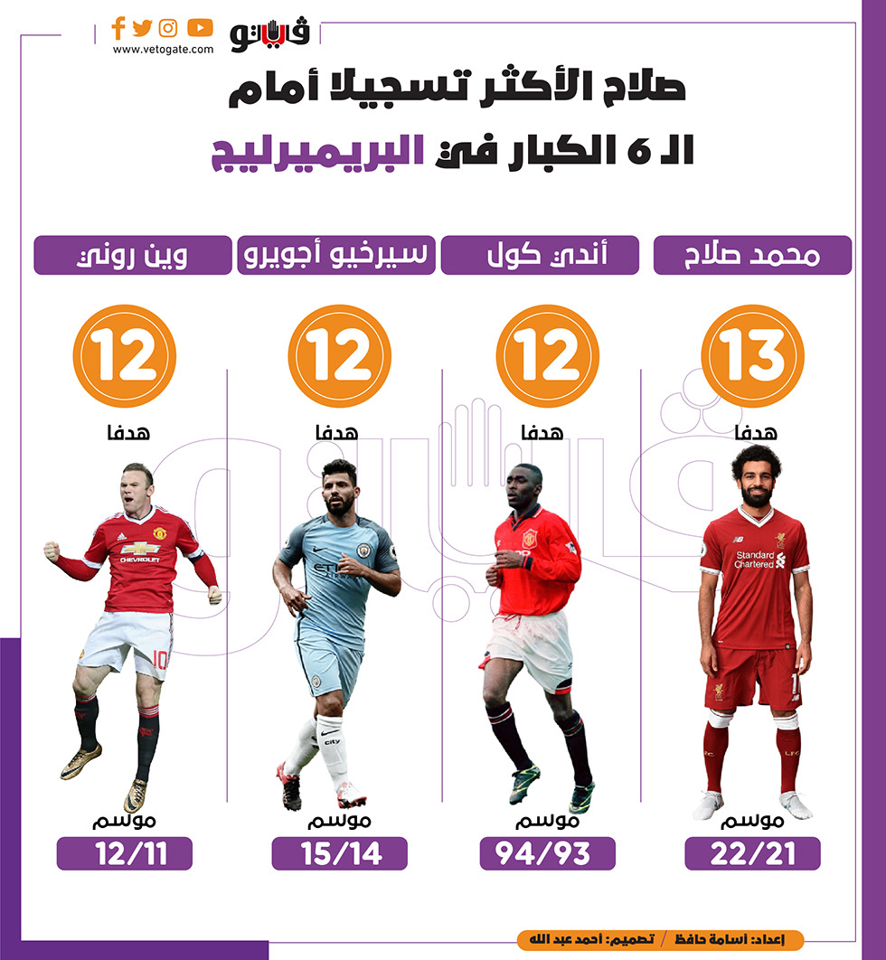 صلاح الأكثر تسجيلا أمام الـ 6 الكبار في البريميرليج| انفو جراف الإثنين 25/أبريل/2022 - 02:16 م 4/25/2022 2:16:35 PM محمد صلاح اسامة حافظ شارك طباعة 18 حجم الخط شارك طباعة محمد صلاح صلاح البريميرليج أجويرو سيرخيو أجويرو
