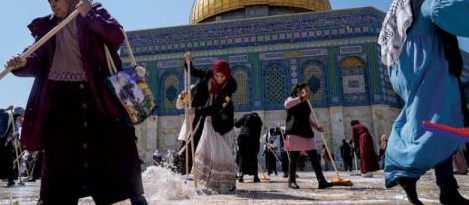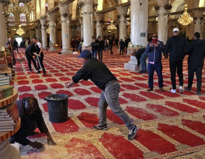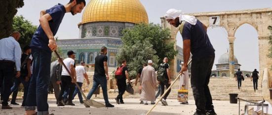 وبعد أن دنس الصهاينة ساحات المسجد الأقصى أظهرت مقاطع الفيديو تنظيف الفلسطينيين للمسجد الأقصى من آثار الاشتباكات مع قوات جيش الاحتلال الإسرائيلي.
