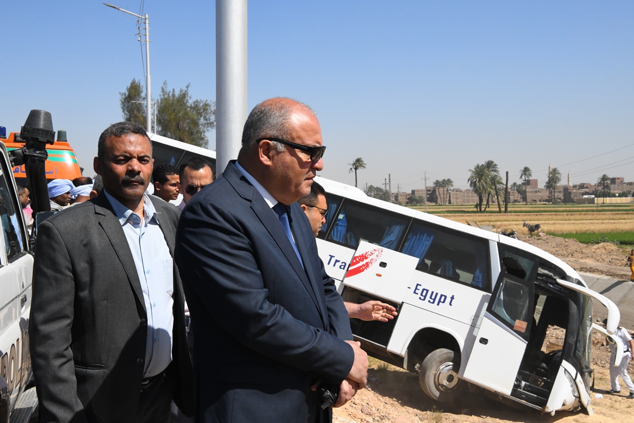 محافظ قنا ينتقل لموقع حادث تصادم سيارة ملاكي بأتوبيس سياحي | صور