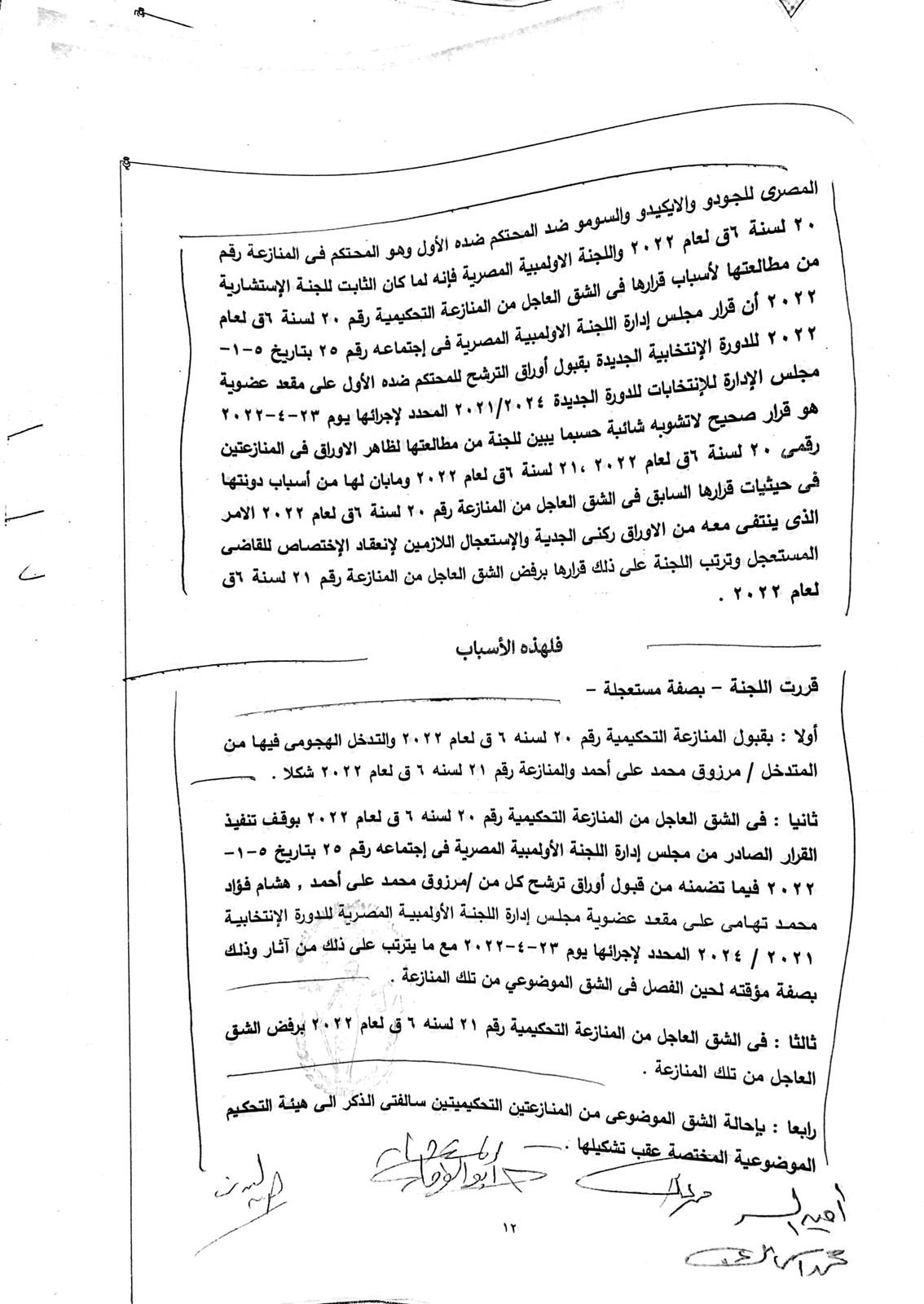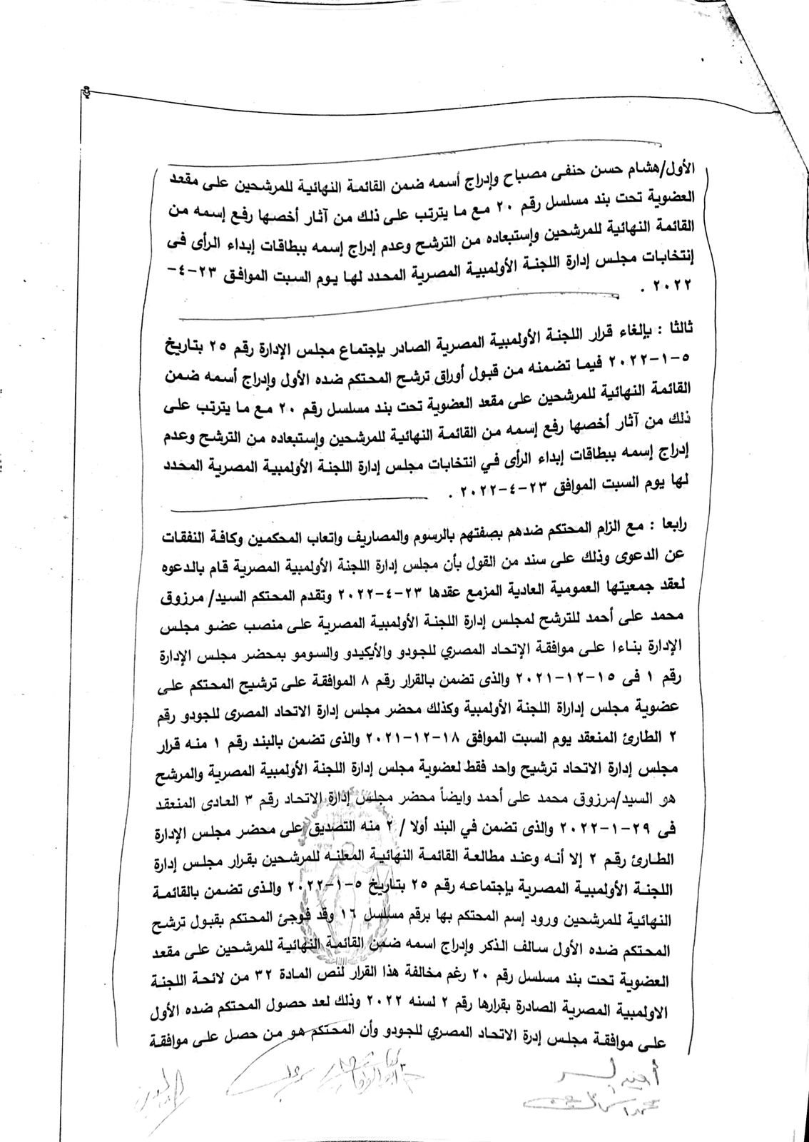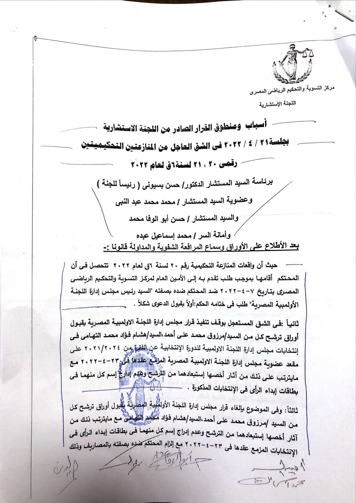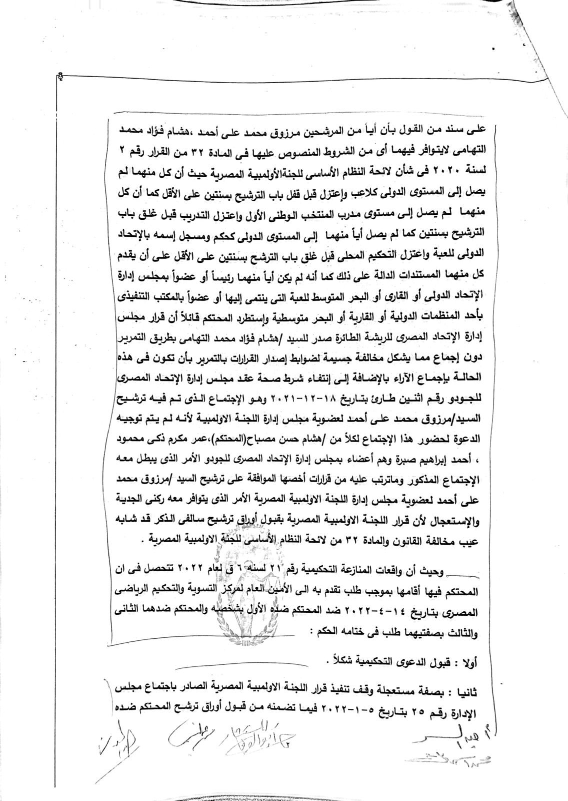 وكان مركز التسوية والتحكيم الرياضي، قرر استبعاد كل من مرزوق علي وهشام التهامي من انتخابات اللجنة الأولمبية، المقرر إقامتها يوم السبت المقبل.