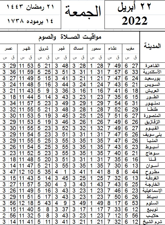 وجاءت مواقيت الصلاة اليوم وفقًا للتوقيت المحلي لمدينتي القاهرة والإسكندرية وعدد من مدن ومحافظات الجمهورية كالتالي: