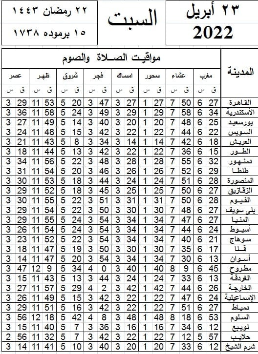 وجاءت مواقيت الصلاة اليوم وفقًا للتوقيت المحلي لمدينتي القاهرة والإسكندرية وعدد من مدن ومحافظات الجمهورية كالتالي: