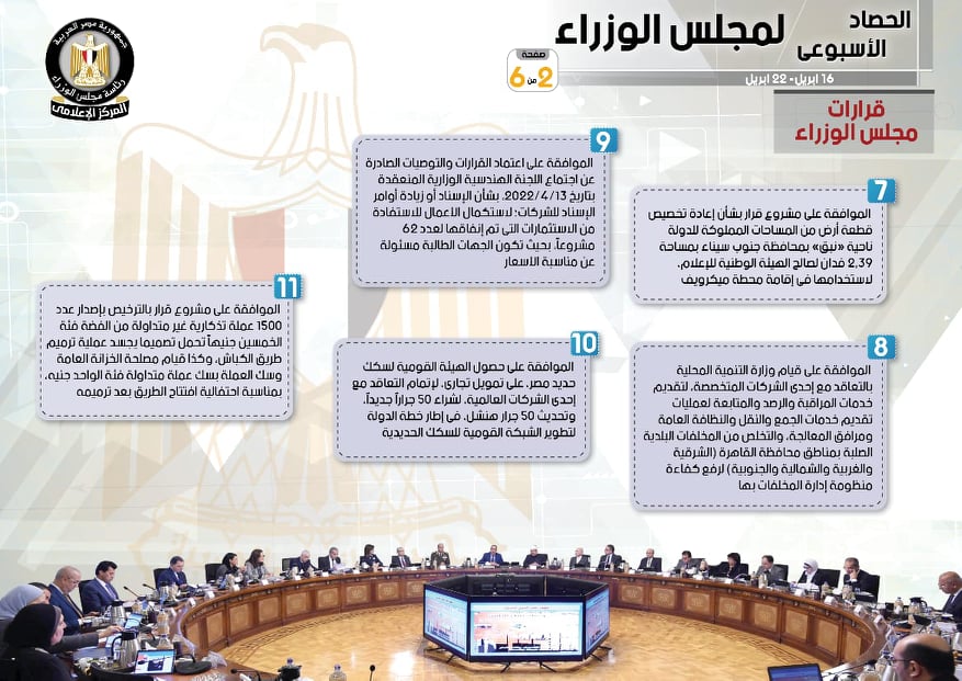 واستكمالًا للقرارات، أشار التقرير إلى أنه قد تمت الموافقة على اعتماد القرارات والتوصيات الصادرة عن اجتماع اللجنة الهندسية الوزارية المنعقدة بتاريخ 13/4/2022، بشأن الإسناد أو زيادة أوامر الإسناد للشركات؛ لاستكمال الأعمال للاستفادة من الاستثمارات التي تم إنفاقها لـ 62 مشروعًا، بحيث تكون الجهات الطالبة مسئولة عن مناسبة الأسعار، وكذلك الموافقة على حصول الهيئة القومية لسكك حديد مصر، على تمويل تجاري، لإتمام التعاقد مع إحدى الشركات العالمية، لشراء 50 جرارًا جديدًا، وتحديث 50 جرار هنشل، في إطار خطة الدولة لتطوير الشبكة القومية للسكك الحديدية، فضلًا عن الموافقة على مشروع قرار بالترخيص بإصدار عدد 1500 عملة تذكارية غير متداولة من الفضة فئة الخمسين جنيهًا تحمل تصميما يجسد عملية ترميم طريق الكباش، وكذا قيام مصلحة الخزانة العامة وسك العملة بسك عملة متداولة فئة الواحد جنيه، بمناسبة احتفالية افتتاح الطريق بعد ترميمه.