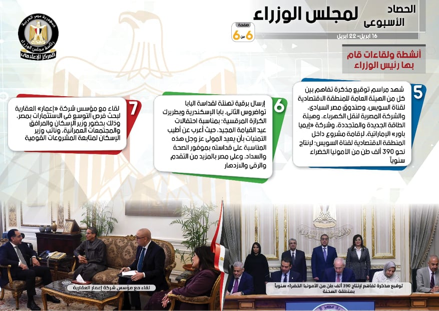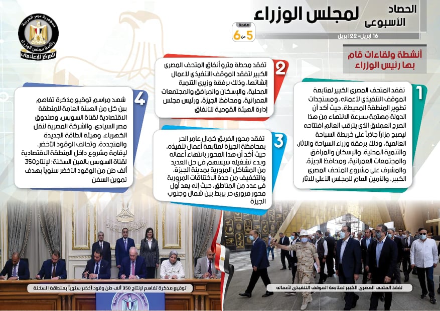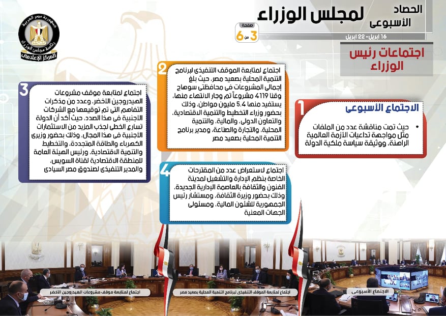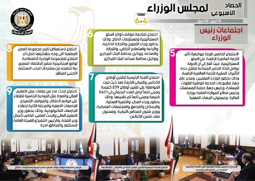 نشر المركز الإعلامي لمجلس الوزراء، تقريرًا شمل إنفوجرافات سلط من خلالها الضوء على الحصاد الأسبوعي لمجلس الوزراء، وذلك خلال الفترة من 16 حتى 22 أبريل 2022، والذي تضمن الموافقة على عدد من القرارات، فضلًا عن الاجتماعات واللقاءات التي عقدها الدكتور مصطفى مدبولي، رئيس مجلس الوزراء، بالإضافة إلى ما قام به من أنشطة.