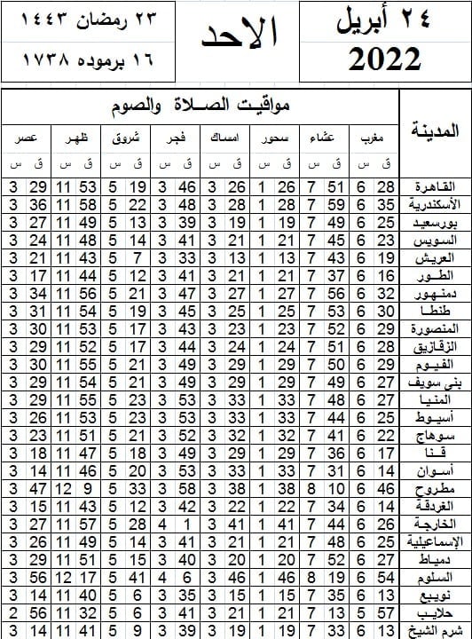 مواقيت الصلاة اليوم الأحد 24-4-2022 في القاهرة والمحافظات