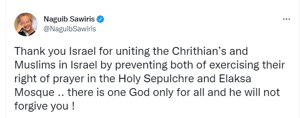 وكتب نجيب ساويرس تغريدة على تويتر: "شكرًا لإسرائيل على توحيد المسيحيين والمسلمين في إسرائيل بمنعهم من ممارسة حقهم في الصلاة في كنيسة القيامة والمسجد الأقصى.. يوجد إله واحد للجميع ولن يغفر لكم!".