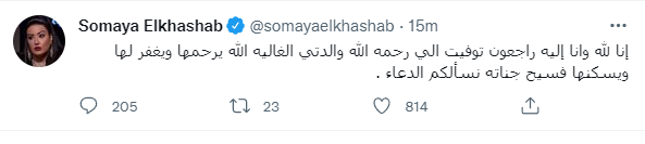 أعلنت الفنانة سمية الخشاب وفاة والدتها عبر حسابها الرسمي بموقع التدوينات القصيرة تويتر، حيث كتبت سمية تغريدة قالت فيها: “إنا لله وإنا إليه راجعون، توفيت إلى رحمة الله والدتي الغالية الله يرحمها ويغفر لها ويسكنها فسيح جناته نسألكم الدعاء”.