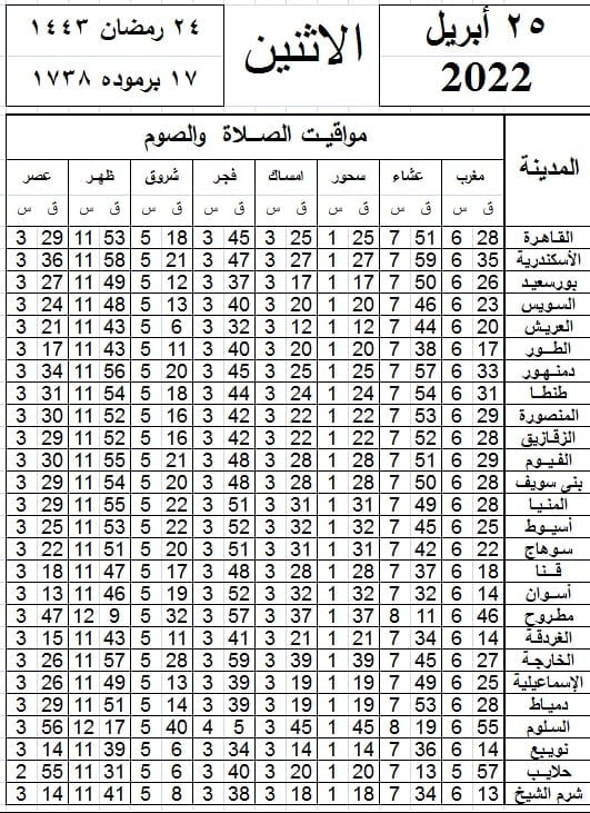 مواقيت الصلاة اليوم الإثنين 25 - 4 - 2022 في القاهرة والمحافظات