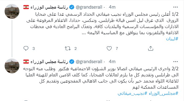 وكتب مجلس الوزراء اللبناني عبر تويتر " تابع رئيس مجلس الوزراء نجيب ميقاتي مع قائد الجيش العماد جوزاف عون ملف البحث عن ركاب الزورق الذي غرق ليل أمس قبالة طرابلس والتحقيقات الجارية في الحادثة. وقد ابدى الرئيس ميقاتي حزنه الشديد للحادثة المؤلمة..."