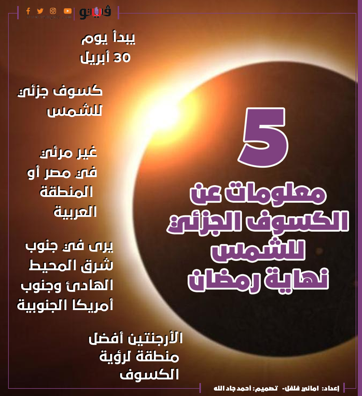 5 معلومات عن الكسوف الجزئي للشمس نهاية رمضان| إنفوجراف الثلاثاء 26/أبريل/2022 - 02:18 م 4/26/2022 2:18:14 PM الشمس أماني فلفل شارك طباعة 18 حجم الخط شارك طباعة الشمس كسوف جزئى للشمس الأرجنتين
