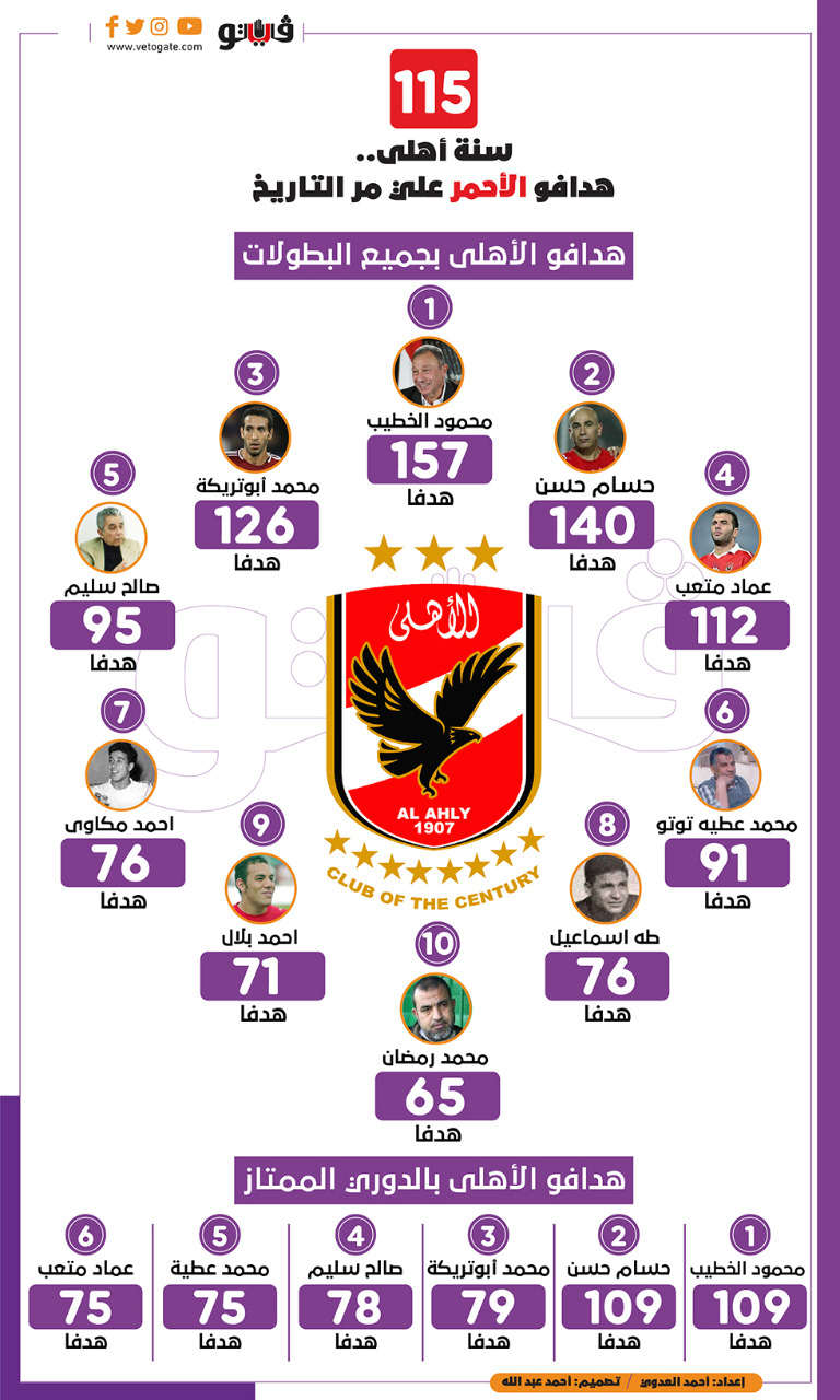 115 سنة أهلى.. هدافو الأحمر علي مر التاريخ | انفوجراف الإثنين 25/أبريل/2022 - 02:15 م 4/25/2022 2:15:17 PM فريق الأهلي أحمد العدوي شارك طباعة 18 حجم الخط شارك طباعة محمود الخطيب حسام حسن محمد أبوتريكة اخبار الأهلي اخبار الرياضة الأهلي