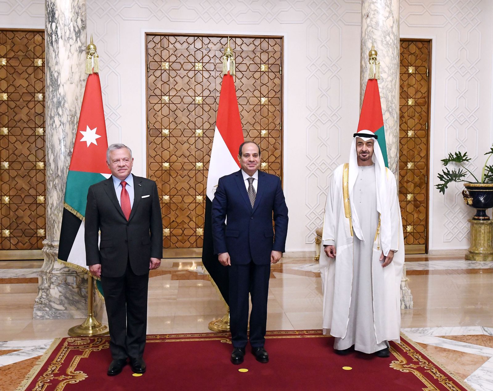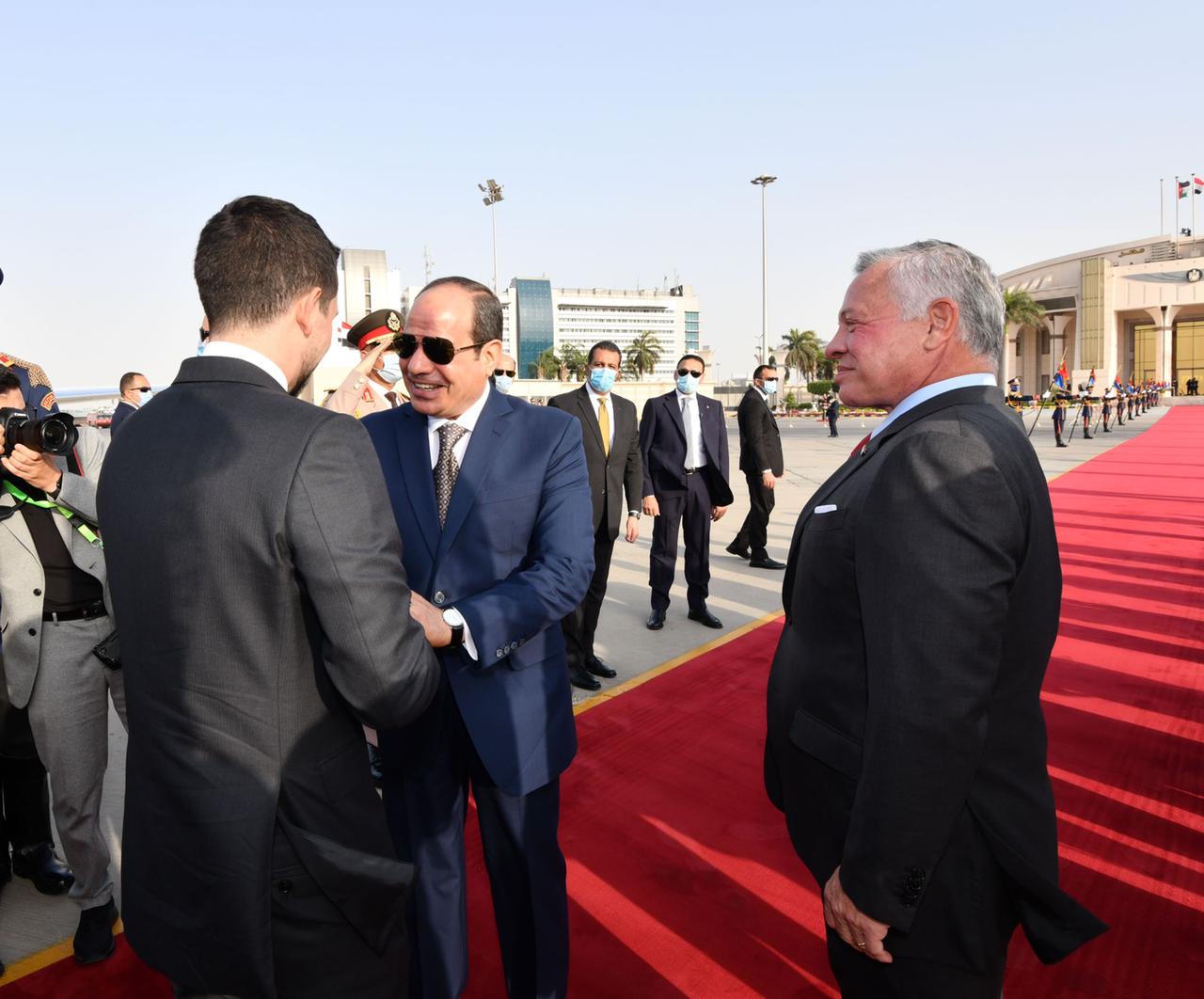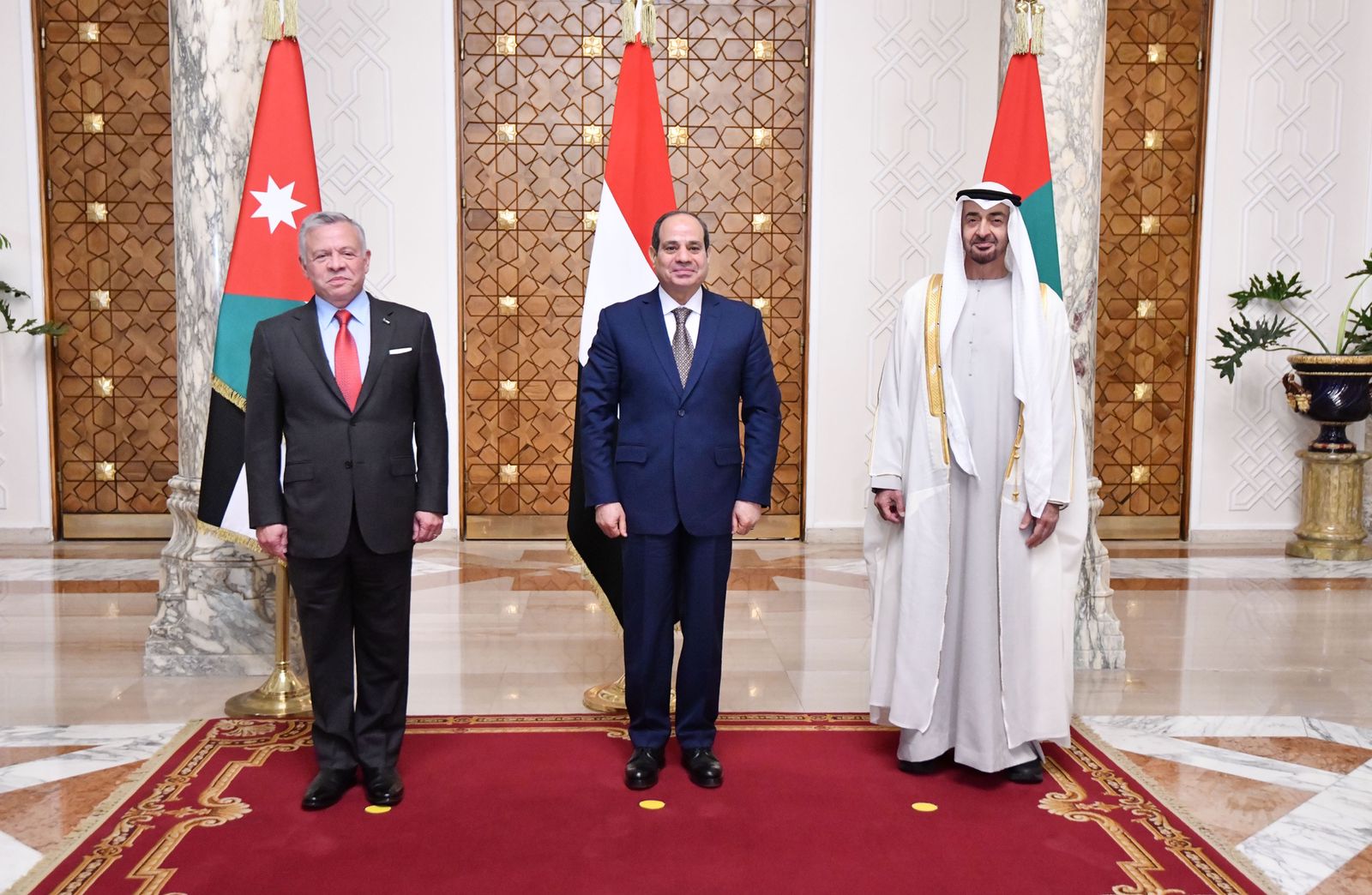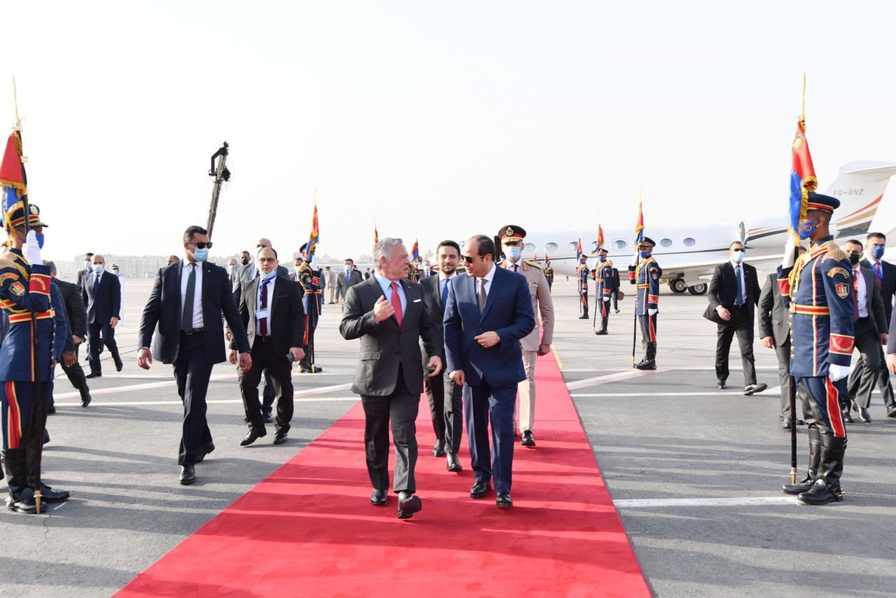 من جانبهما، ثمَّن ضيفا مصر الروابط الوثيقة التي تجمع بين البلدان الثلاثة، مؤكدين الحرص على الارتقاء بالتعاون مع مصر إلى مستوى الشراكة الإستراتيجية، وذلك لمصلحة الشعوب الشقيقة في الدول الثلاث، وبما يعظم استفادتها من الفرص والإمكانات الكامنة في علاقات التعاون بينهم، ويضيف مزيدًا من الزخم إلى هذا التعاون المثمر في القطاعات المختلفة، فضلًا عن كون هذه العلاقات تمثل حجر أساس للحفاظ على الأمن والاستقرار الإقليمي وإعادة التوازن للمنطقة، وذلك في ضوء الأهمية المحورية لمصر والأردن والإمارات إقليميًّا ودوليًّا.