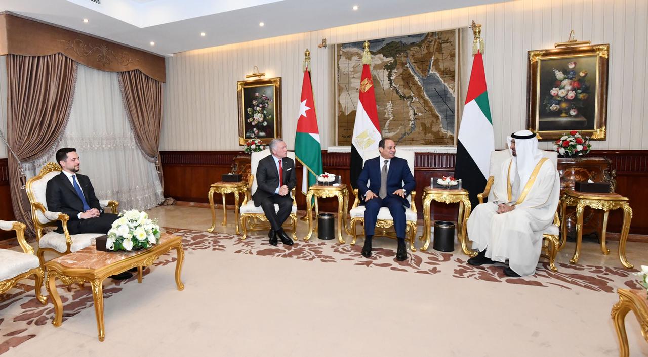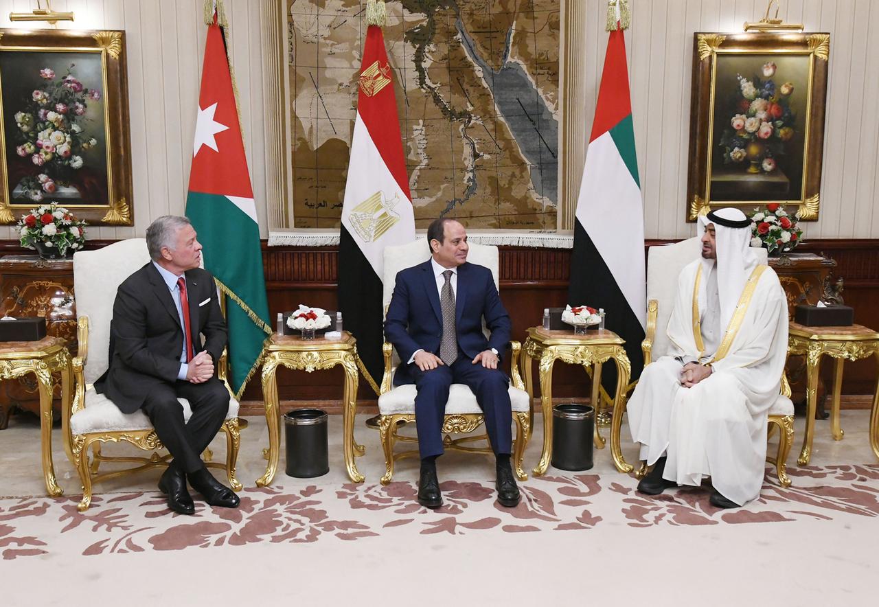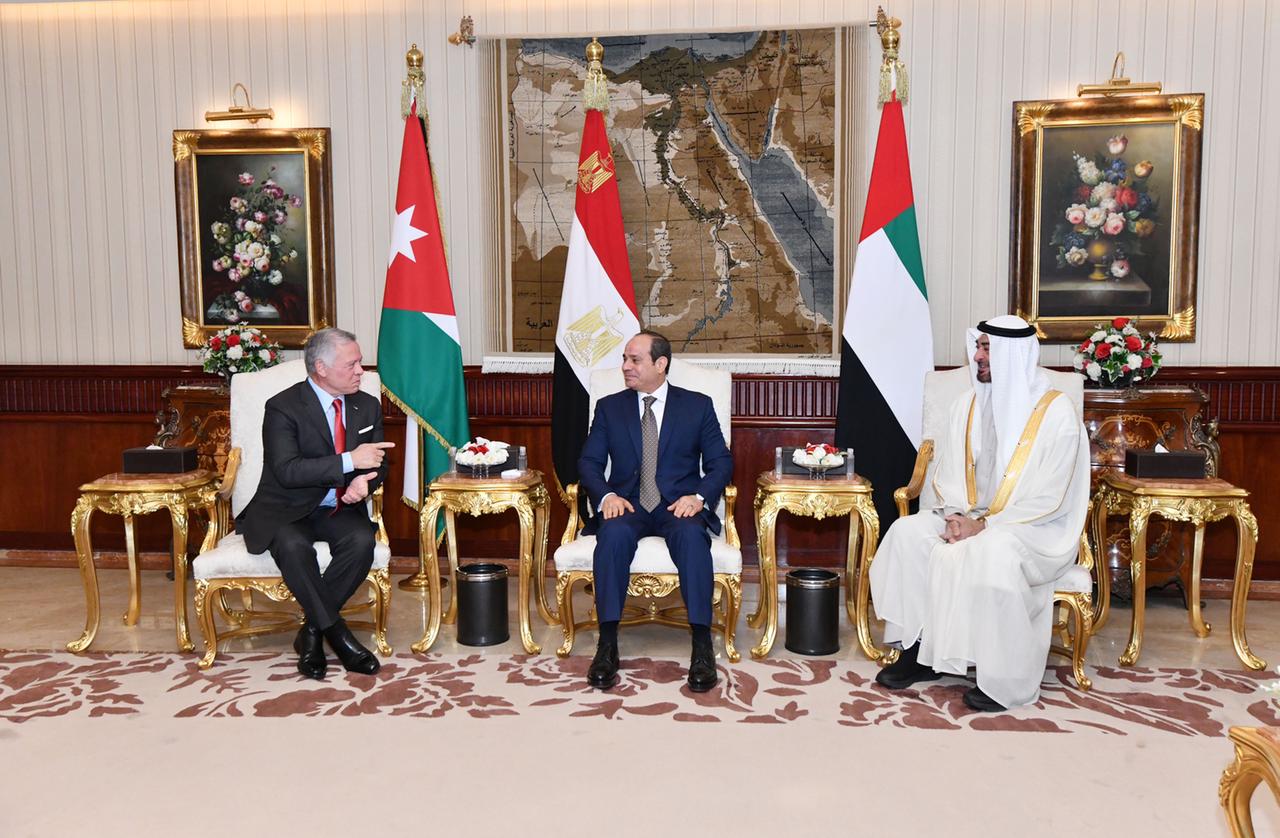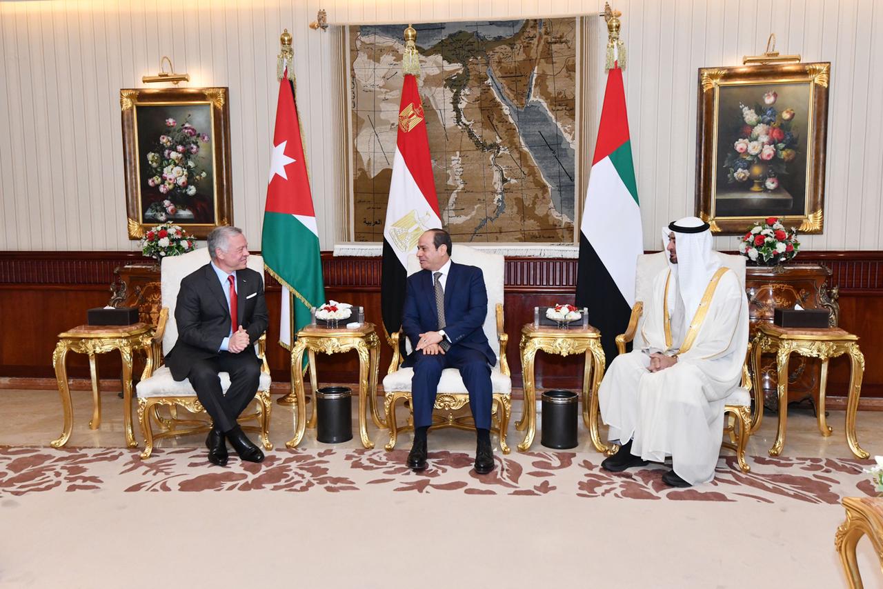 ورحب الرئيس بشقيقيه الأردني والإماراتي ضيفين عزيزين على مصر، معربًا عن التقدير للعلاقات الوثيقة والتاريخية التي تجمع البلدان الثلاثة على المستويين الرسمي والشعبي، فضلًا عن التشابك الحضاري الممتد بينها، ومؤكدًا تطلع مصر إلى تعزيز التعاون البناء بين مصر والأردن والإمارات، والانطلاق معًا نحو آفاق واسعة من الشراكة الإستراتيجية التي تؤسس لعلاقات ممتدة وتحقق المصالح المشتركة، وتصب في خانة تعزيز العمل العربي المشترك، خاصةً في ظل التحديات الكبيرة التي تموج بها المنطقة، فضلًا عن الأزمات الاقتصادية والاجتماعية الناجمة عن التطورات الإقليمية والدولية المتعددة.