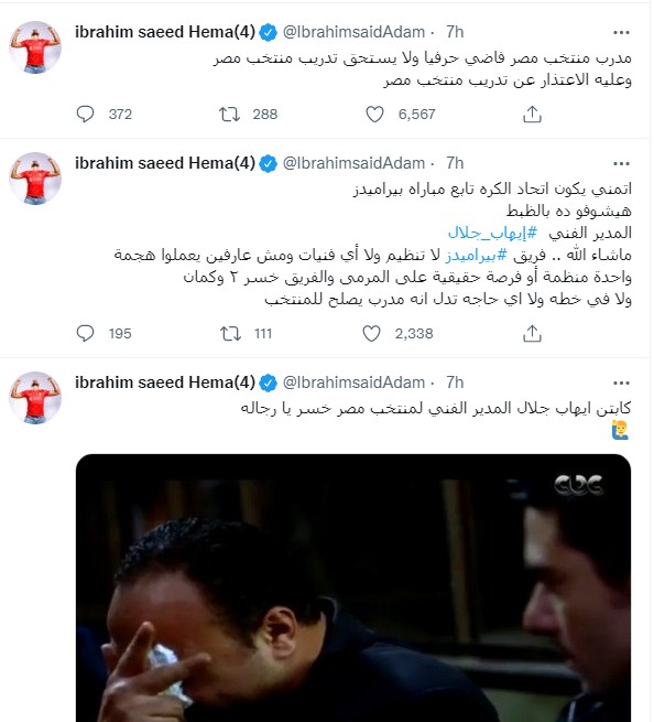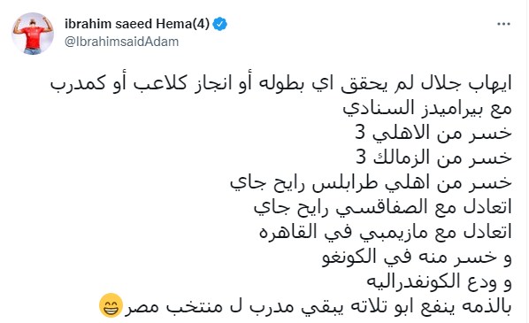وكان إبراهيم سعيد كتب في تغريدات سابقة وبعد هزيمة نادي بيراميدز أما مازيمبي "كابتن إيهاب جلال المدير الفني لمنتخب مصر خسر يا رجالة".