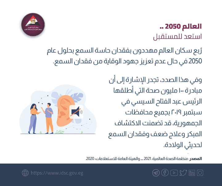 نشر مركز المعلومات ودعم اتخاذ القرار بمجلس الوزراء عبر صفحته الرسمية على موقع التواصل الاجتماعي فيسبوك، إنفوجراف، بشأن تحذيرات منظومة الصحة العالمية من خطورة فقدان حاسة السمع.