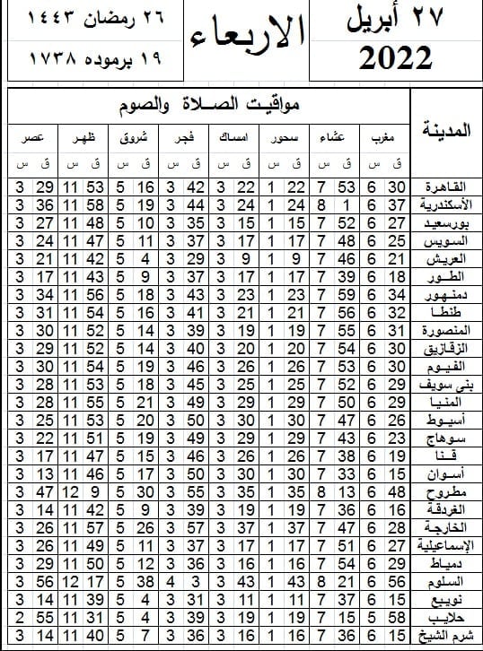 وجاءت مواقيت الصلاة اليوم وفقًا للتوقيت المحلي لمدينتي القاهرة والإسكندرية وعدد من مدن ومحافظات الجمهورية كالتالي: